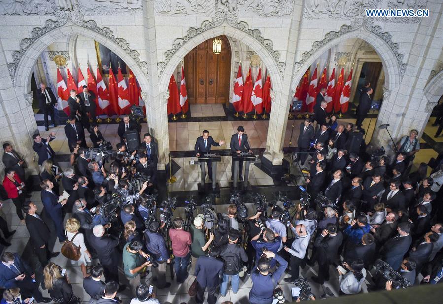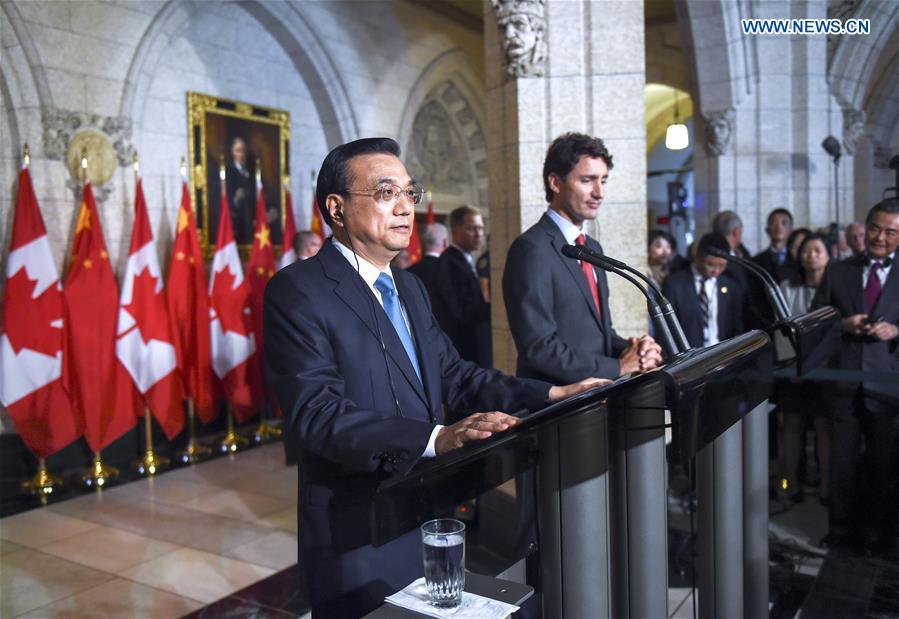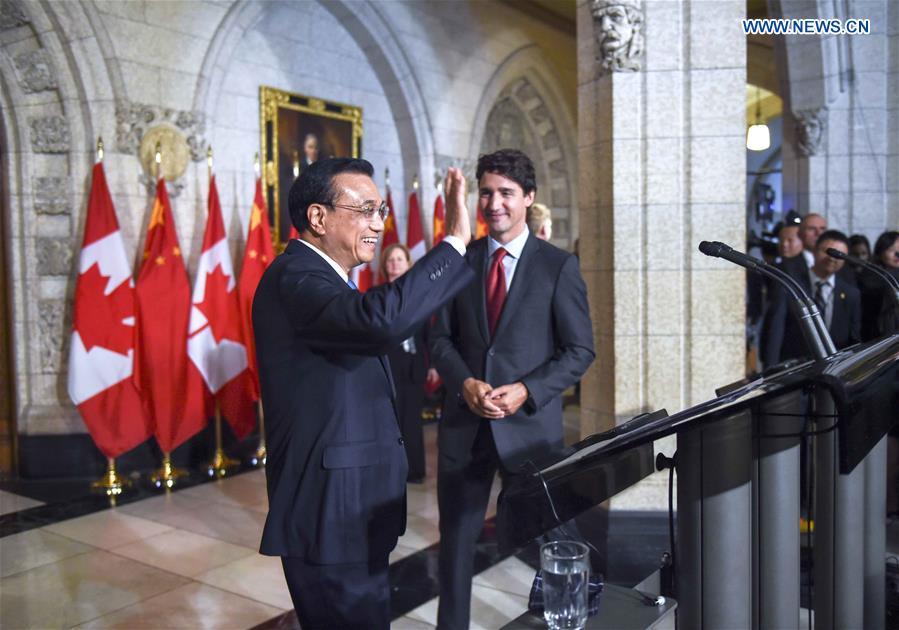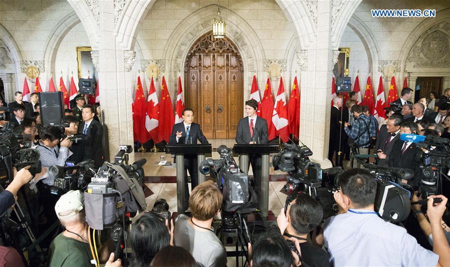 Chinese Premier Li Keqiang (L) meets journalists together with his Canadian counterpart Justin Trudeau (R) in Ottawa, Canada, Sept. 22, 2016. (Photo/Xinhua)