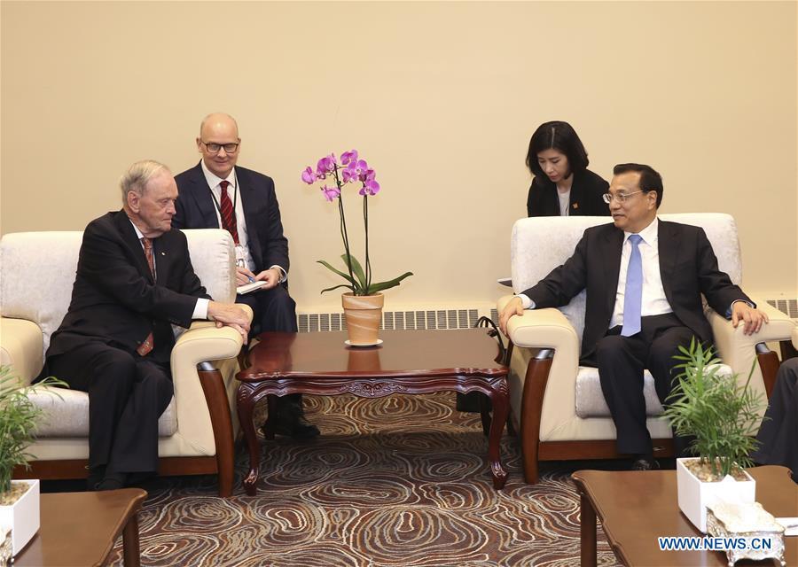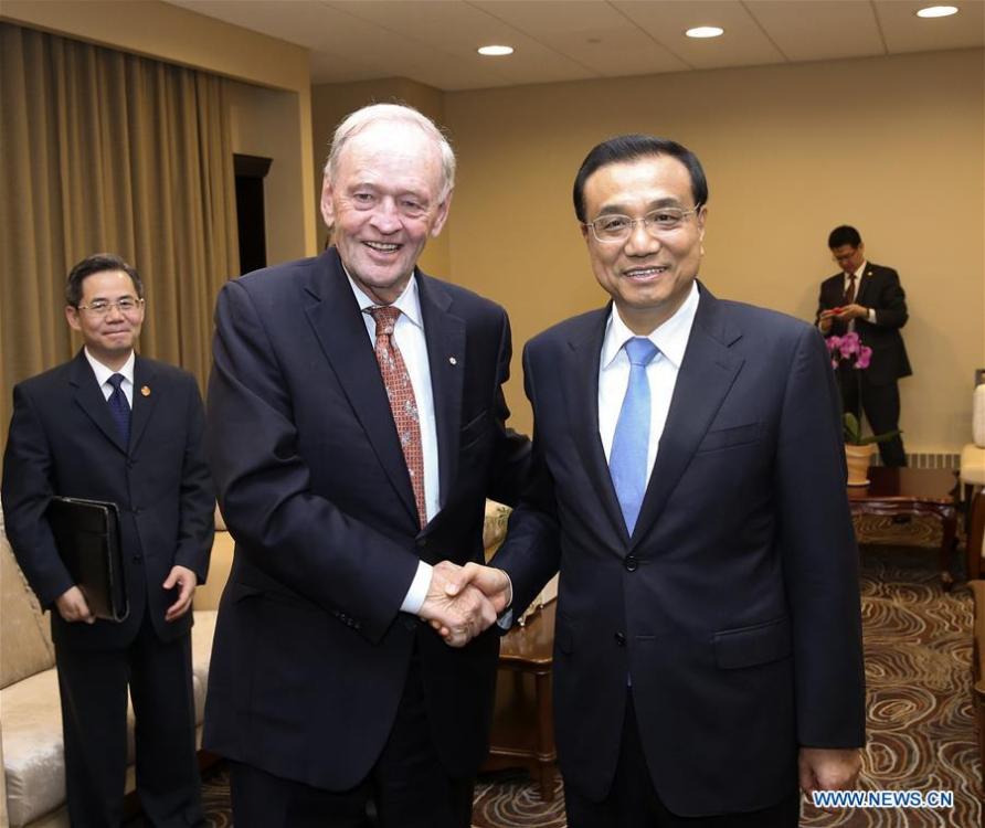 Chinese Premier Li Keqiang (R) meets with former Canadian Prime Minister Jean Chretien in Ottawa, Canada, Sept. 22, 2016. (Photo/Xinhua)