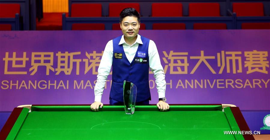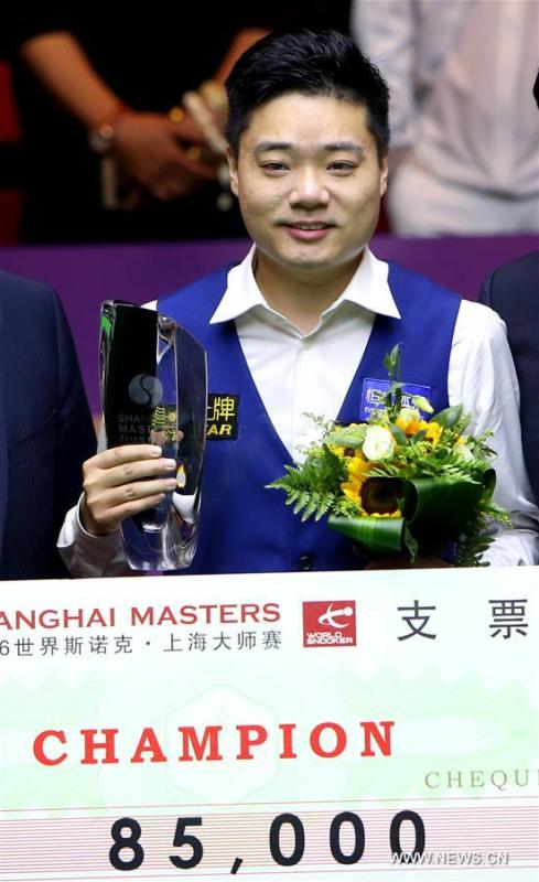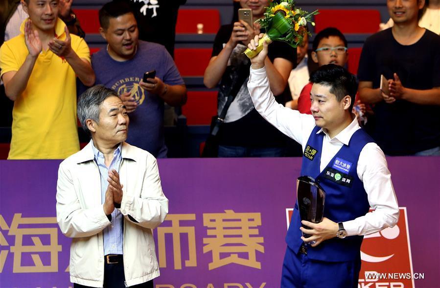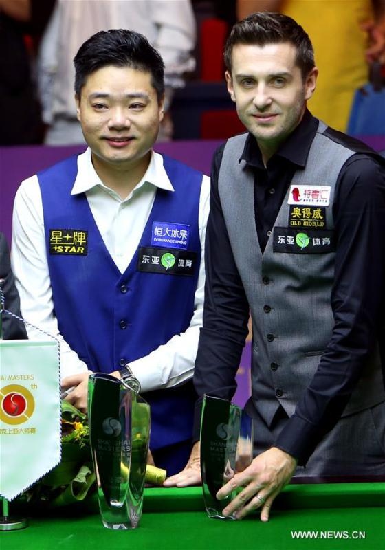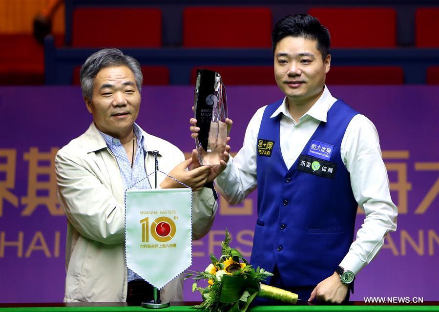 Ding Junhui (L) of China poses with Mark Selby of England after the final match of the 2016 Shanghai Masters world snooker tournament in Shanghai, China, Sept. 25, 2016. Ding won 10-6 to claim the title. (Photo/Xinhua)