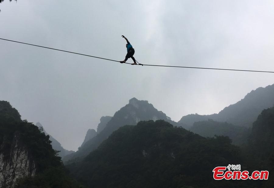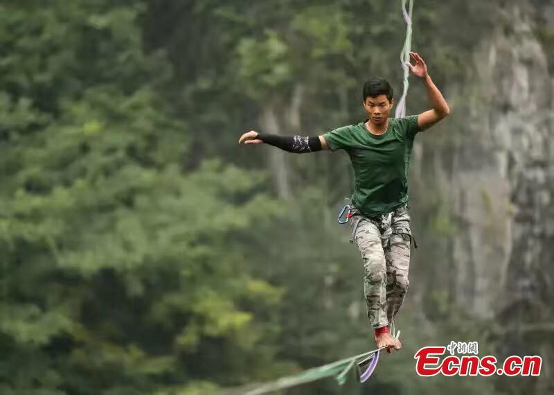 A participant walks on a webbing during a highline contest at Wuling Rift Valley in Southwest China’s Chongqing Municipality. Nearly 20 challengers from China and abroad joined the highline contest, with 24-year-old Jediah Doohan from the UK winning the championship. (Photo: China News Service/Zhong Xin)