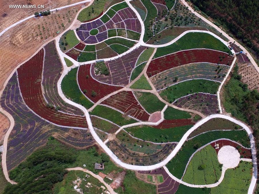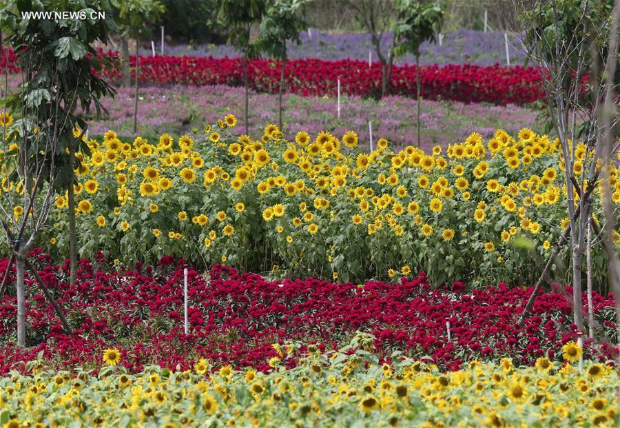 Photo taken on Sept. 26, 2016 shows an aerial view of flower fields by Huayu Lake of Nanyang Town in Qingxiu District of Nanning, capital city of south China's Guangxi Zhuang Autonomous Region. (Photo/Xinhua)