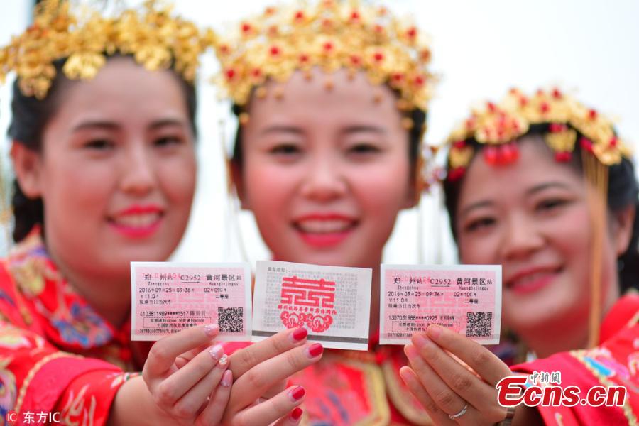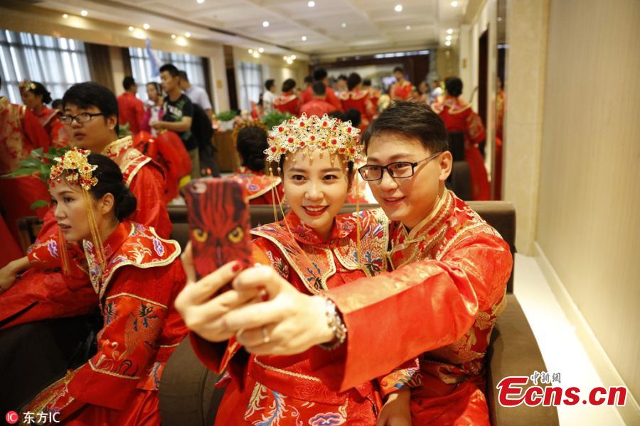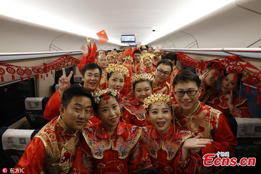Newlywed couples from a railway bureau pose for photos at a group wedding ceremony on a train in Zhengzhou City, the capital of Central China’s Henan Province, Sept. 26. 2016. Forty-eight couples from the Zhengzhou Railway Bureau wearing traditional costumes completed the wedding formalities on a train. The bureau has organized 162 couples in four years to marry on a train. (Photo/IC)