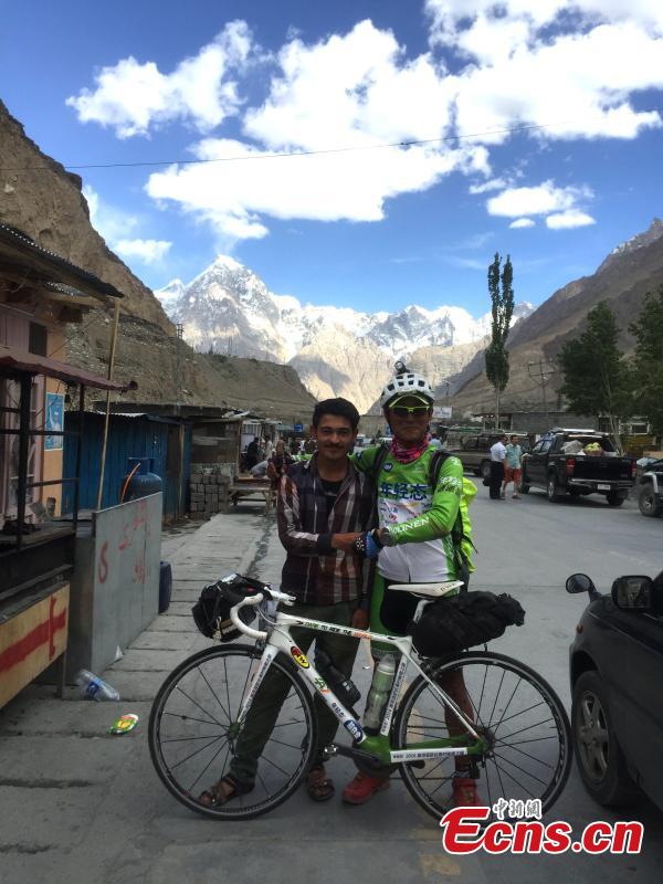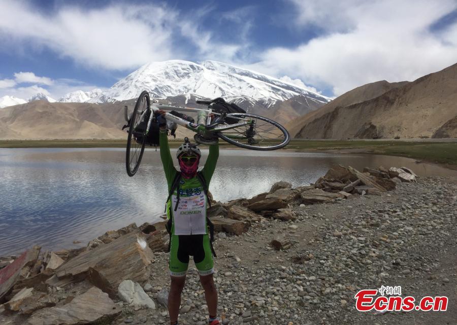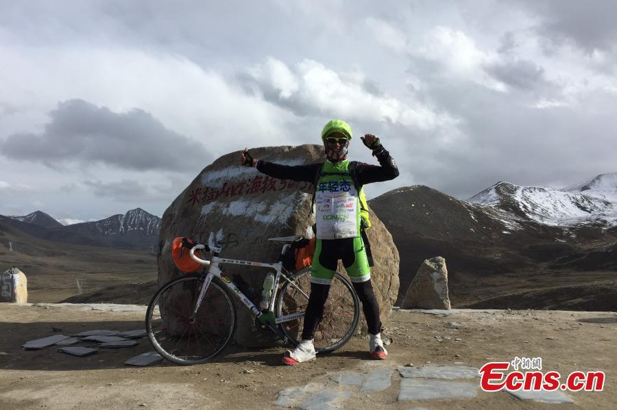 Cycling enthusiast Gou Huanqiang poses for a picture on a road leading to Tibet in June 2016. A native of Qingdao City in Shandong Province, Gou started his cycling challenge from Chengdu City, the capital of Southwest China’s Sichuan Province, on May 4 and arrived in Lisbon, Portugal after an 87-days ride covering 15,800 kilometers. The man in his late forties said he realized the importance of health after his parents and wife died of diseases. In 2012, he made a five-year cycling plan that concluded with a cross-continental journey, the most challenging leg of his program. (Photo: China News Service/Zhong Xin)