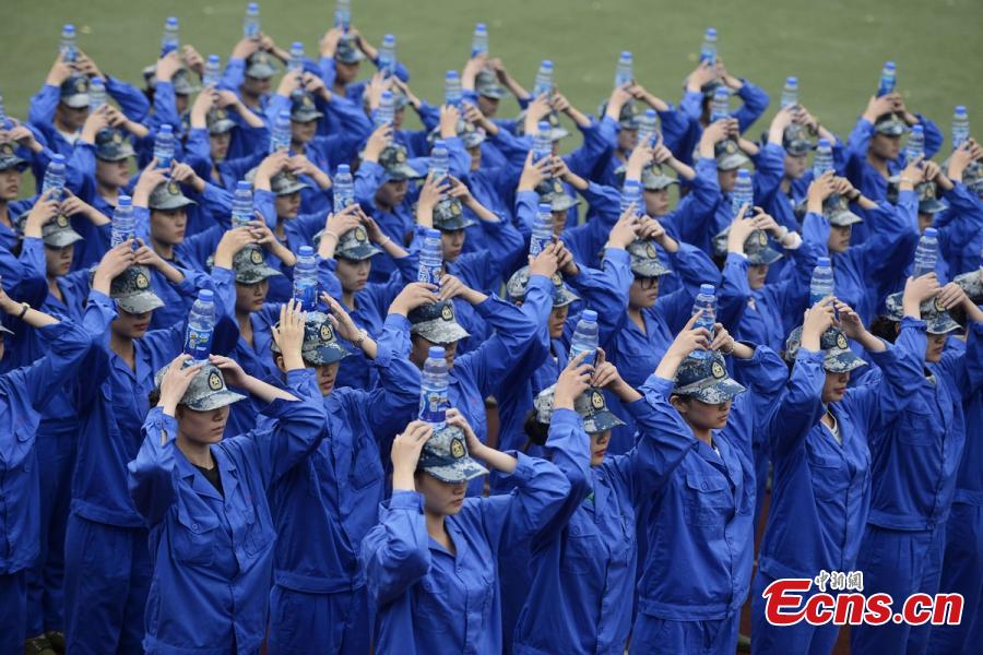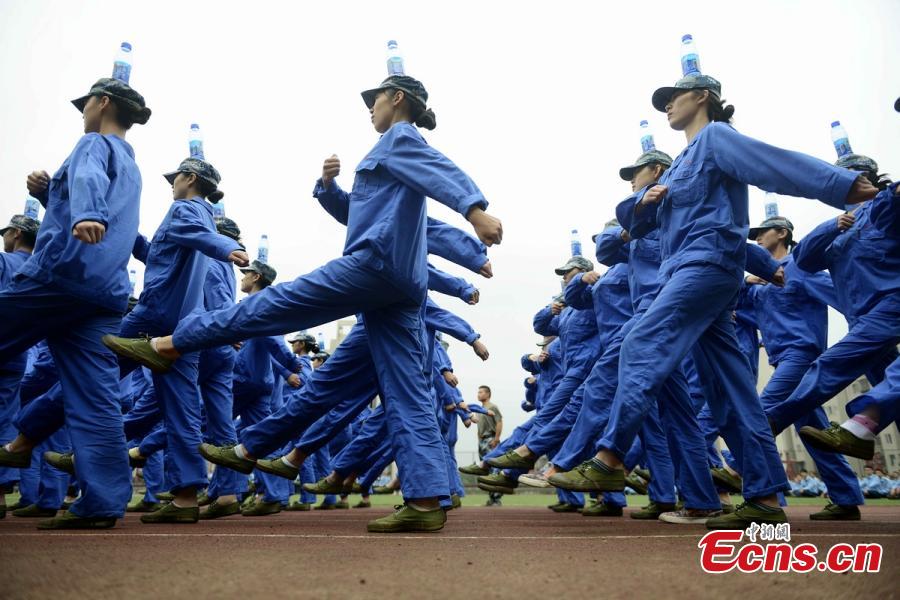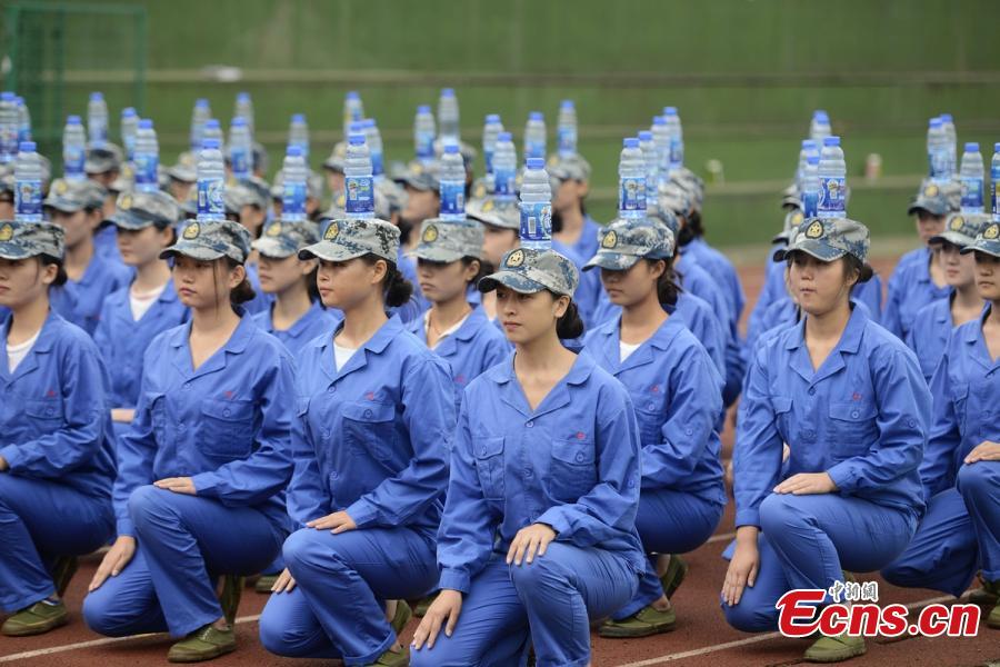 Freshmen students carrying water bottles on their heads receive military training at Changsha Aeronautical Vocational and Technical College in Changsha City, the capital of Central China’s Hunan Province, Sept. 28, 2016. First-year college students in China receive compulsory military training that usually includes a diverse range of programs. (Photo: China News Service/Yang Huafeng)