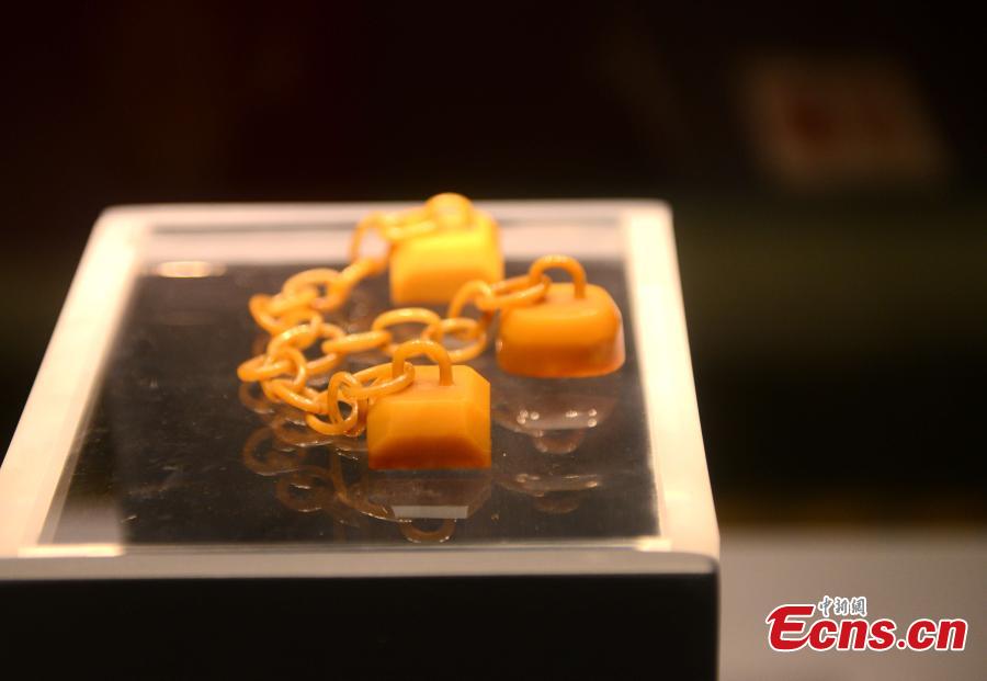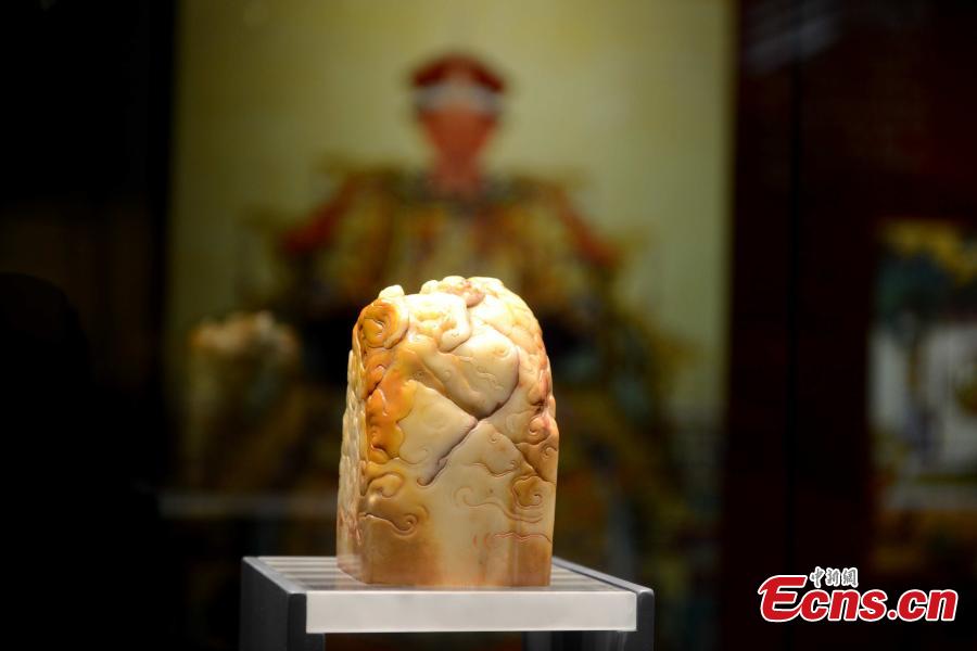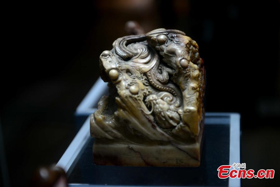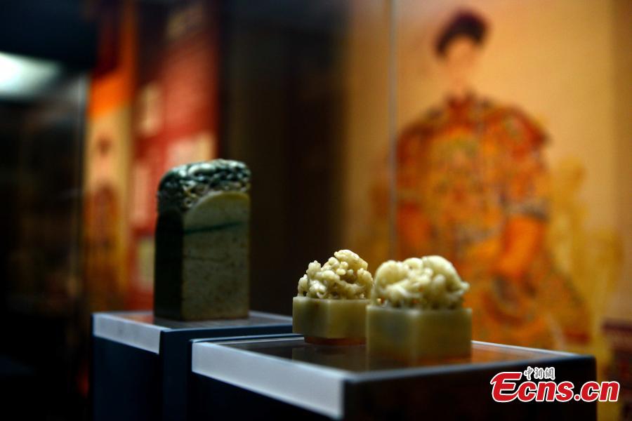 Visitors look at imperial jade seals made with Shoushan stone during an exhibition at Fujian Museum in Fuzhou City, the capital of East China’s Fujian Province, Sept. 29, 2016. The exhibition showed Shoushan stone treasures used by the Qing Dynasty (1644 -1911) emperors, previously kept at the Palace Museum in Beijing. Shoushan stone, also known as agalmatolite, is commonly used for carving or collecting, and is named after the richest resource area of agalmatolite in China - Shoushan village in Fuzhou. (Photo: China News Service/Wang Dongming)