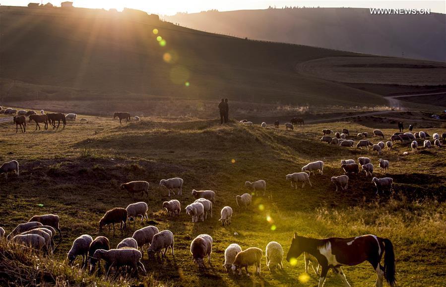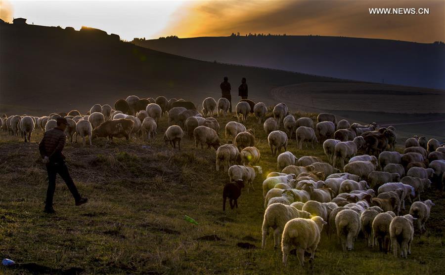Shepherds tend sheep on the grassland in Qitai County, northwest China's Xinjiang Uygur Autonomous Region, Sept. 29, 2016. (Xinhua/Wang Fei)