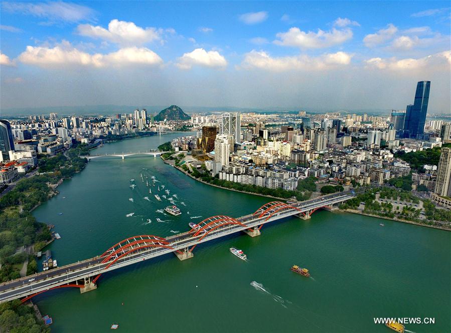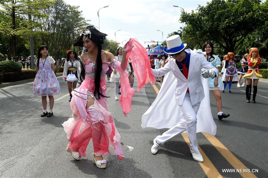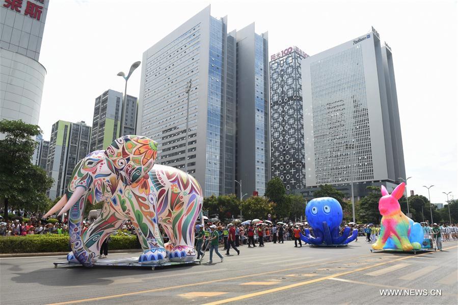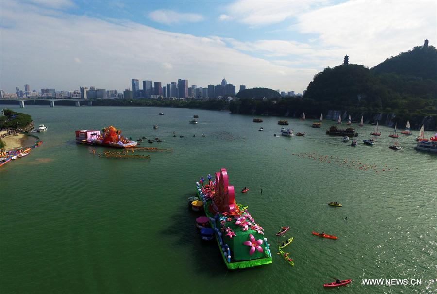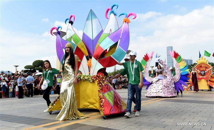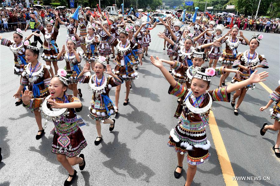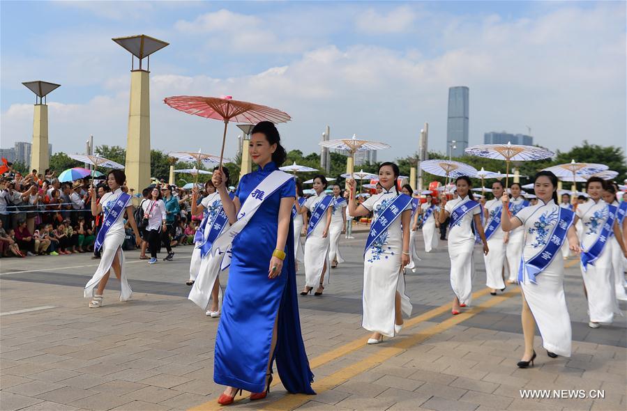 Women wearing cheongsam attend a parade during the 2016 China Liuzhou International Carnival in Liuzhou, south China's Guangxi Zhuang Autonomous Region, Oct. 1, 2016. The carnival, including aquatic and land formations, attracted lots of citizens and visitors. (Xinhua/Ren Pengfei)