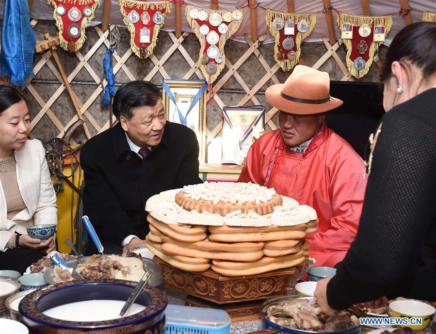 Liu Yunshan (2nd L), a member of the Standing Committee of the Political Bureau of the Central Committee of the Communist Party of China, visits the home of a herdsman in Central Aymak of Mongolia Oct. 2, 2016. (Photo:Xinhua/Rao Aimin)