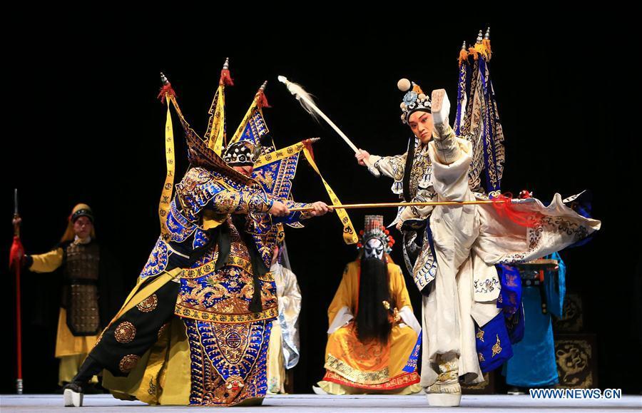 Actors of Shanghai Peking Opera Theater perform "The Revenge of Prince Zi Dan" in Toronto, Canada, Oct. 2, 2016. Shanghai Peking Opera Theater brought three famous traditional Chinese Peking opera plays of "Crossroads", "The Case of Killing Chen Shimei" and "Yang Silang Visits His Mother", as well as the Chinese version of Shakespeare's Hamlet, "The Revenge of Prince Zi Dan" for Canadians to experience the unique traditional Chinese performing art from Saturday to Sunday. (Xinhua/Zou Zheng)