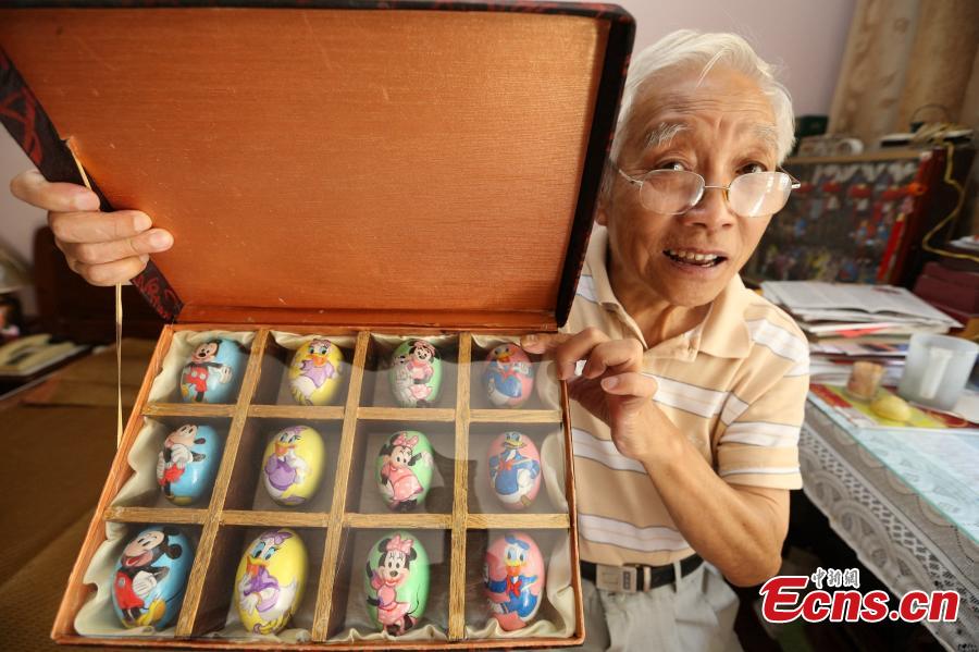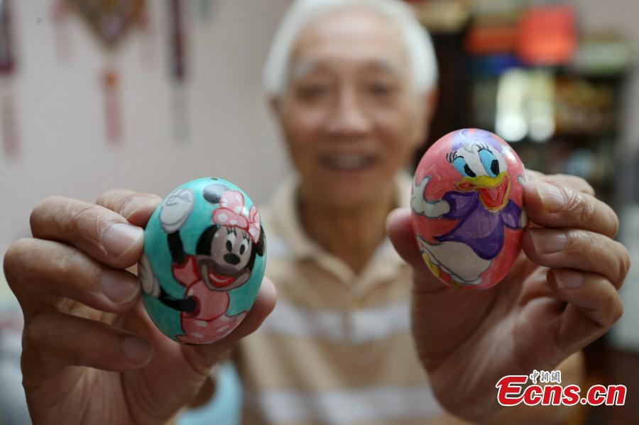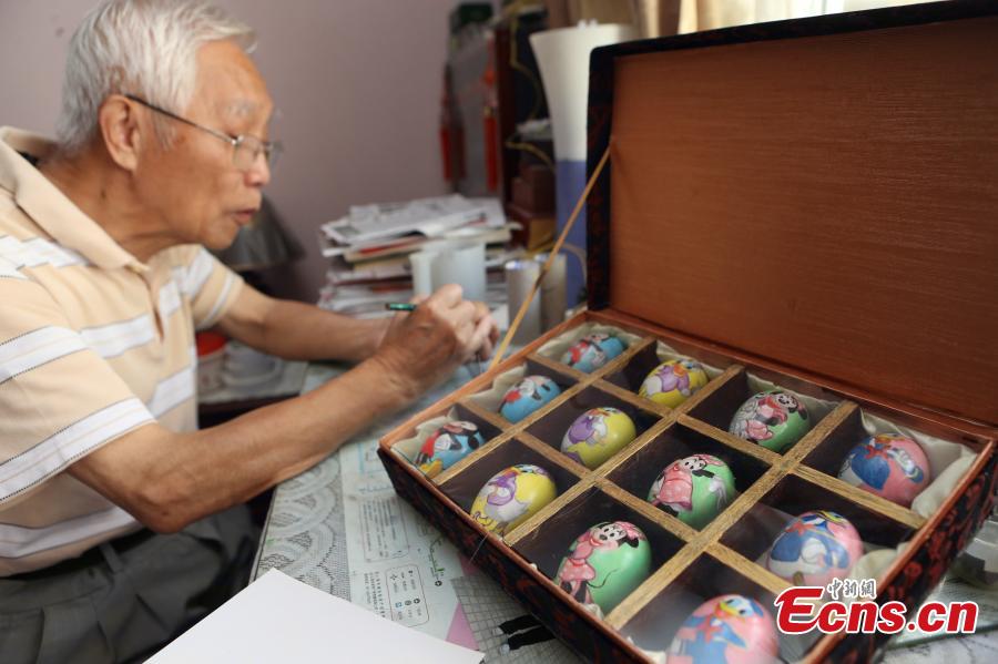 Fei Yongquan shows his paintings on egg shells in Shanghai. The 78-year-old has created over 2,500 egg shell paintings in more than 10 years. As a fan of Peking Opera, Fei made paintings of a broad range of topics, such as the characters in ancient Chinese novels and Disney classics, and Chinese zodiac animals. (Photo: China News Service/Wang Yadong)