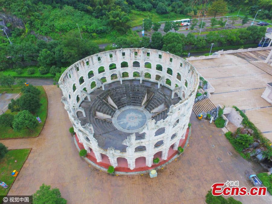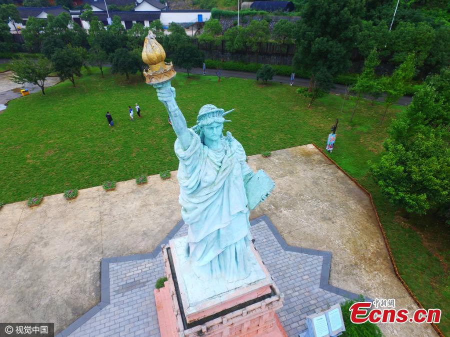 Replicas of world landmarks including the Pyramid, the Great Sphinx, the Acropolis at Athens, the Colosseum, the Arc de Triomphe and the Statue of Liberty are seen at a scenic area in Ningbo City, East China's Zhejiang Province, Oct. 7, 2016. The area claims it allows visitors to travel around the world in one stop. (Photo/CFP)