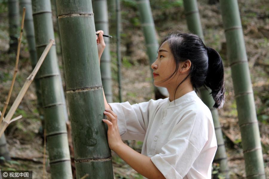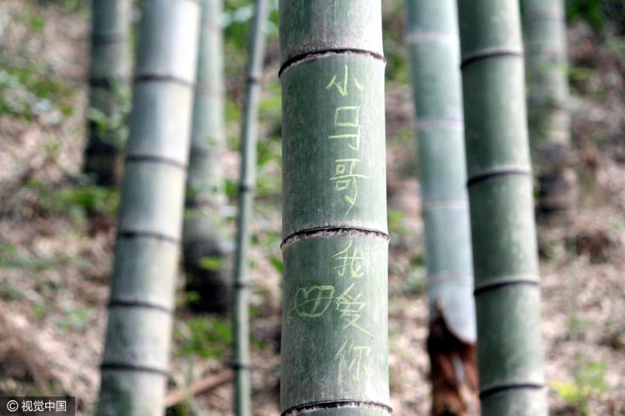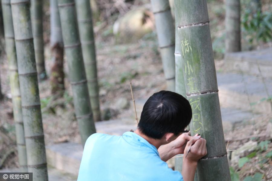 A visitor scribbles a message on bamboo at a scenic area in Qingyuan City, South China’s Guangdong Province, Oct. 7, 2016. Many tourism destinations in China, from the Great Wall to ancient temples, are often marred by graffiti left by unruly visitors. As a management innovation, the bamboo zone at Mountain Jinzi has an area for tourists to write or draw whatever they like. (Photo/CFP)