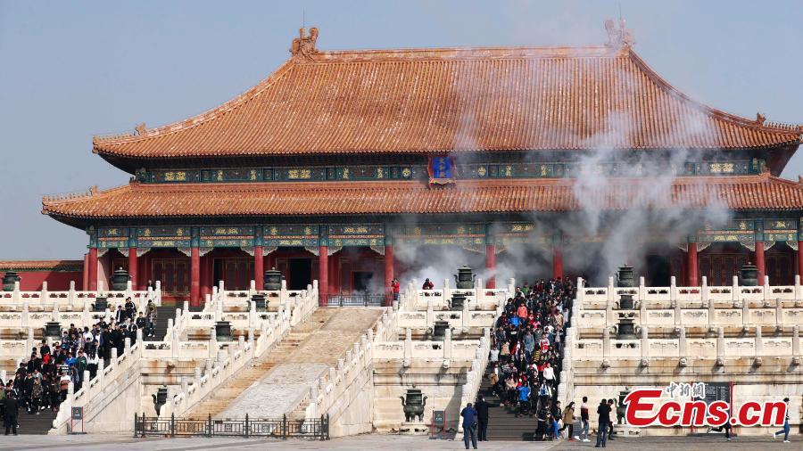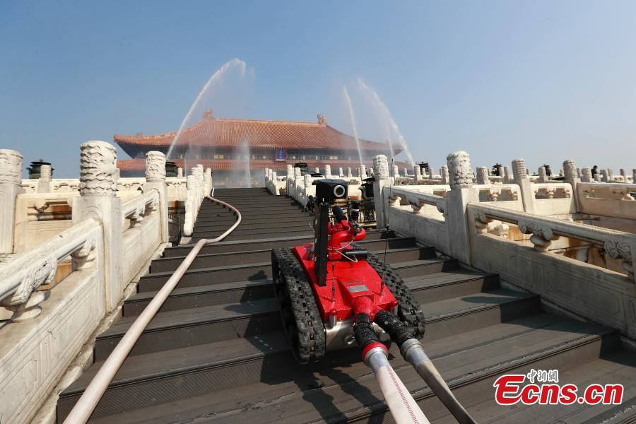 A fire drill in the Palace Museum in Beijing, Oct. 10, 2016. High-tech robots that put out fire were also used in the drill, the largest in recent years, ahead of the museum’s 91st anniversary. (Photo: China News Service/Sheng Jiapeng)