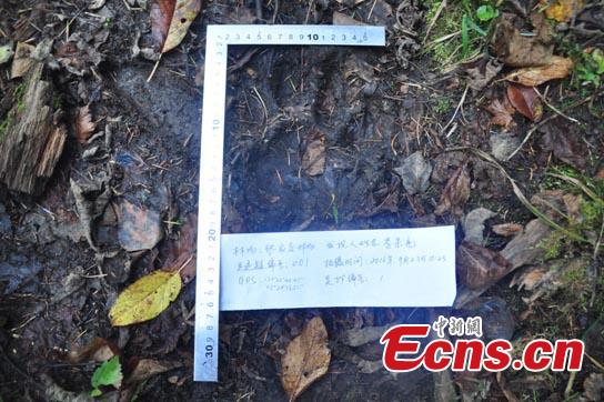 A tiger footprint in the forest in Yanbian Korean Autonomous Prefecture, Northeast China’s Jilin Province. Experts at China’s State Forestry Bureau confirmed two newly found footprints in one week were of adult wild Siberian tigers, the eighth time evidence of the big cat has been found since May 2015. Experts said the area is becoming an important habitat for wild Siberian tigers. (Photo provided to China News Service)
