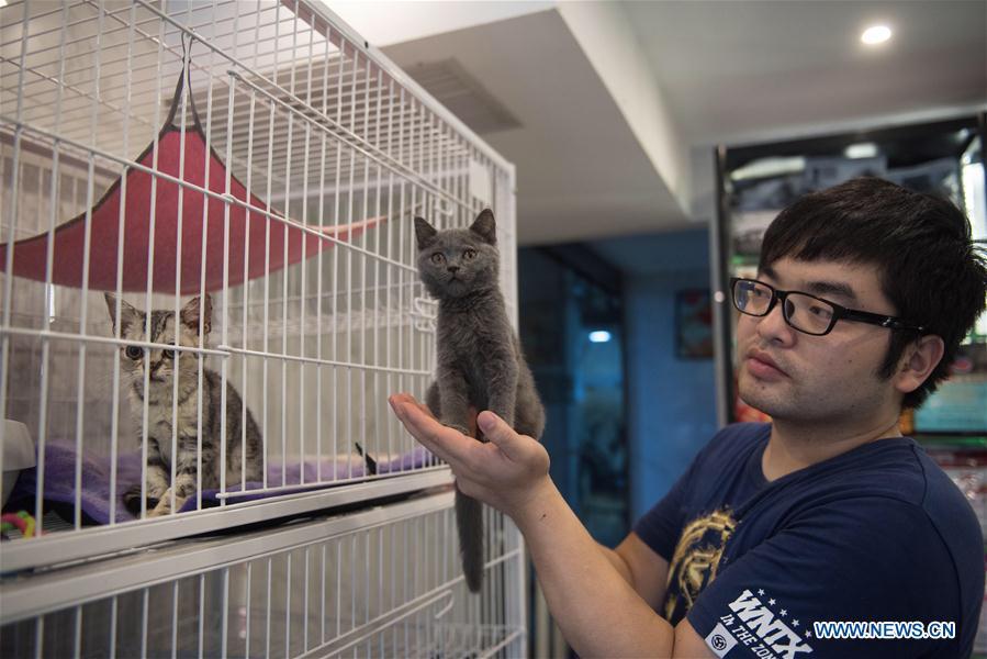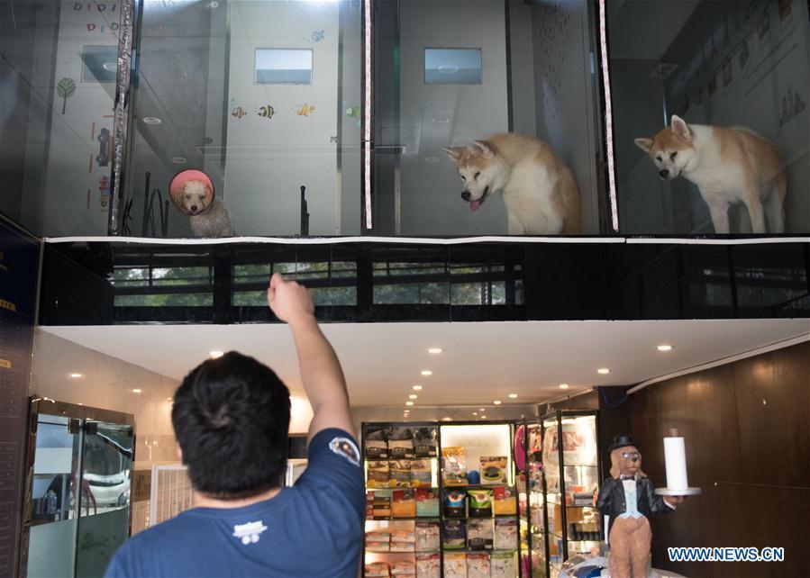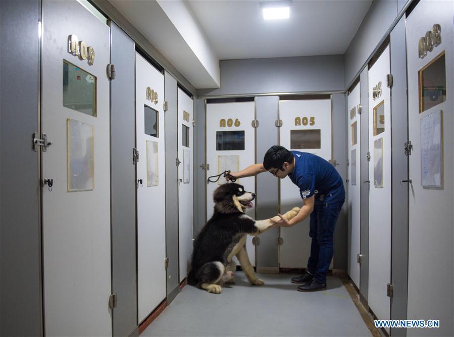 A staff member trains a dog at a pet hotel in Wuhan, capital of central China's Hubei Province, Oct. 10, 2016. The pet industry is booming in China. (Xinhua/Xiong Qi)