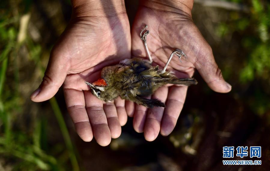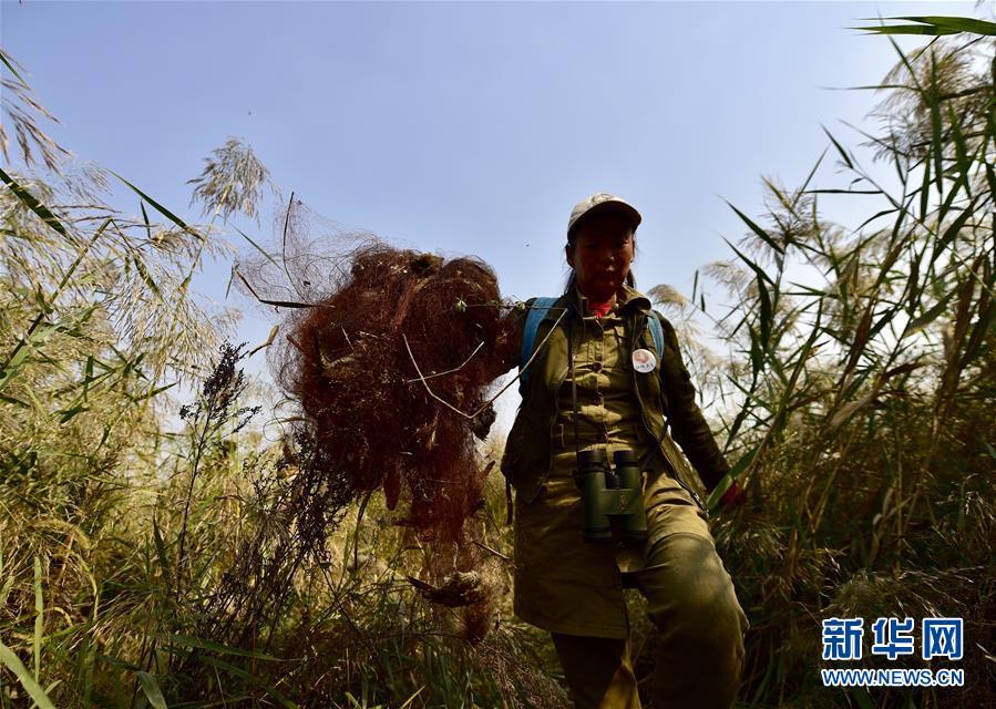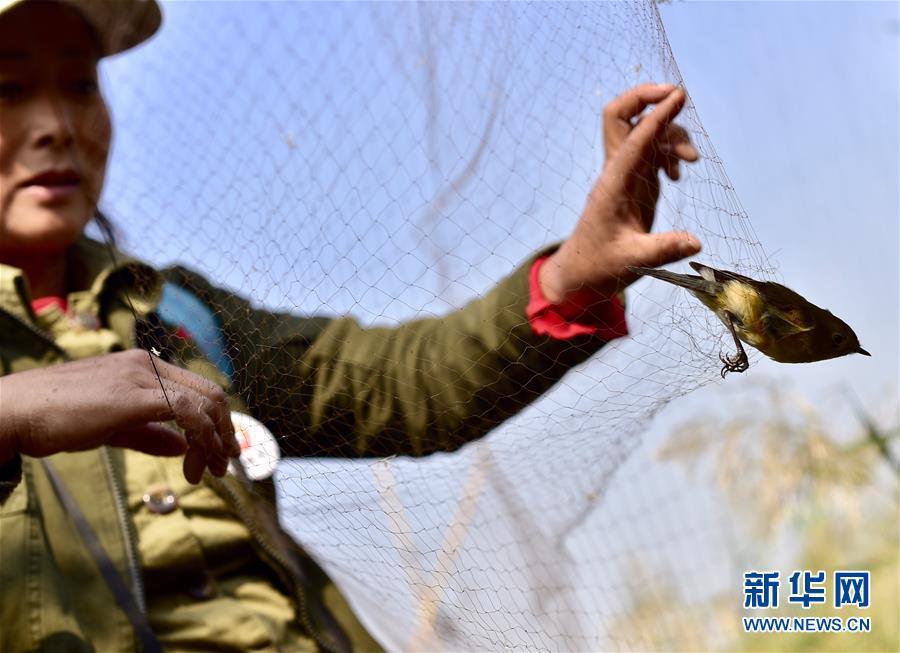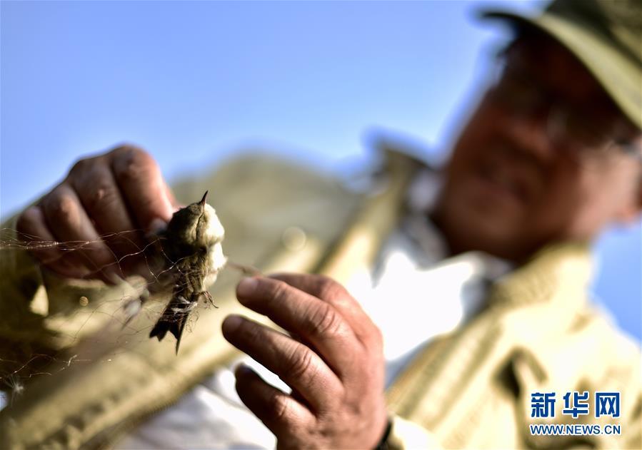 Bird protection volunteer Liu Yidan rescues a bird trapped by a net in Binhai New Area, Tianjin Municipality, Oct. 10, 2016. Volunteers found and demolished a 100-meter-long net, placed by hunters to catch migratory birds. (Photo/Xinhua)