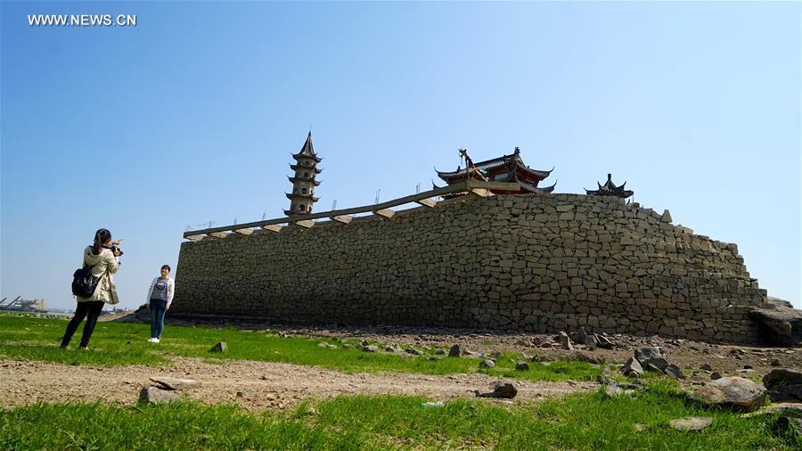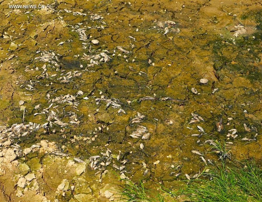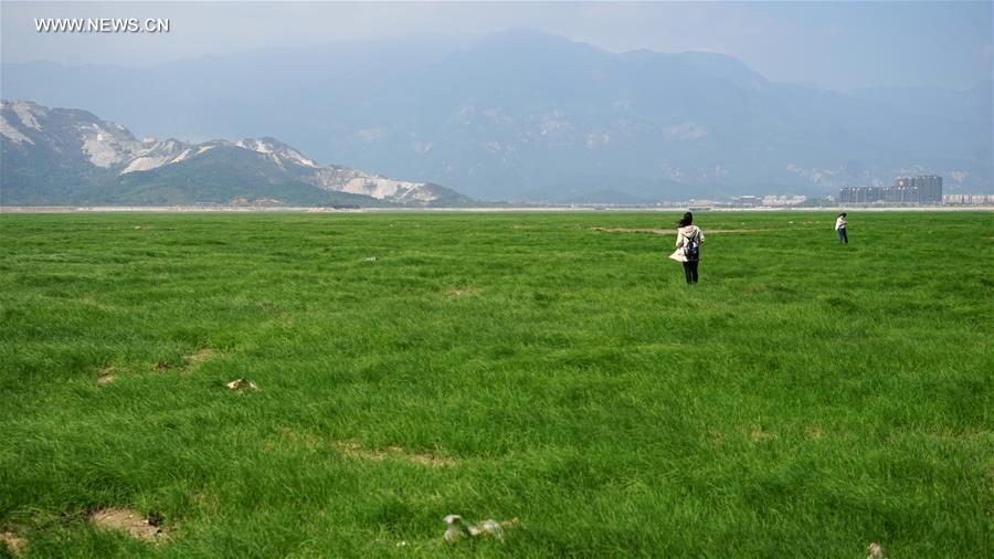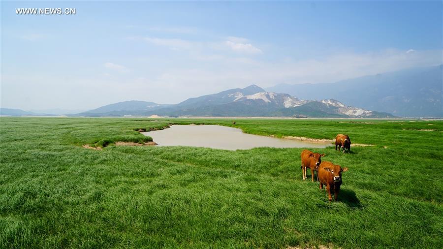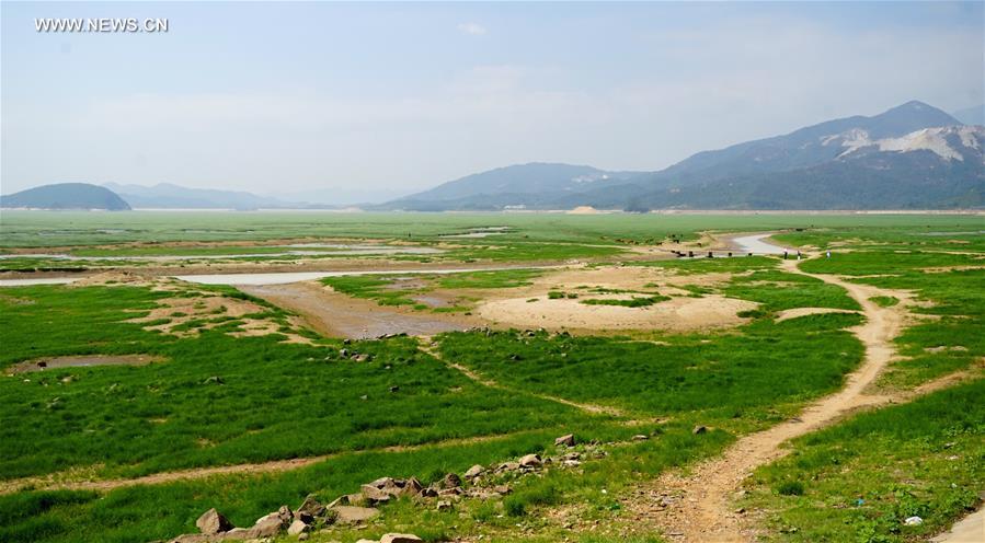 Fishing boats are seen on the exposed bed of Poyang Lake in Lushan City, east China's Jiangxi Province, Oct. 10, 2016. China's largest freshwater lake, Poyang Lake, has seen dramatically decreasing water level in recent days. The lake hit low-water levels about 54 days earlier than average in previous years, according to statistics by the Jiangxi provincial hydrographic bureau. (Photo/Xinhua)