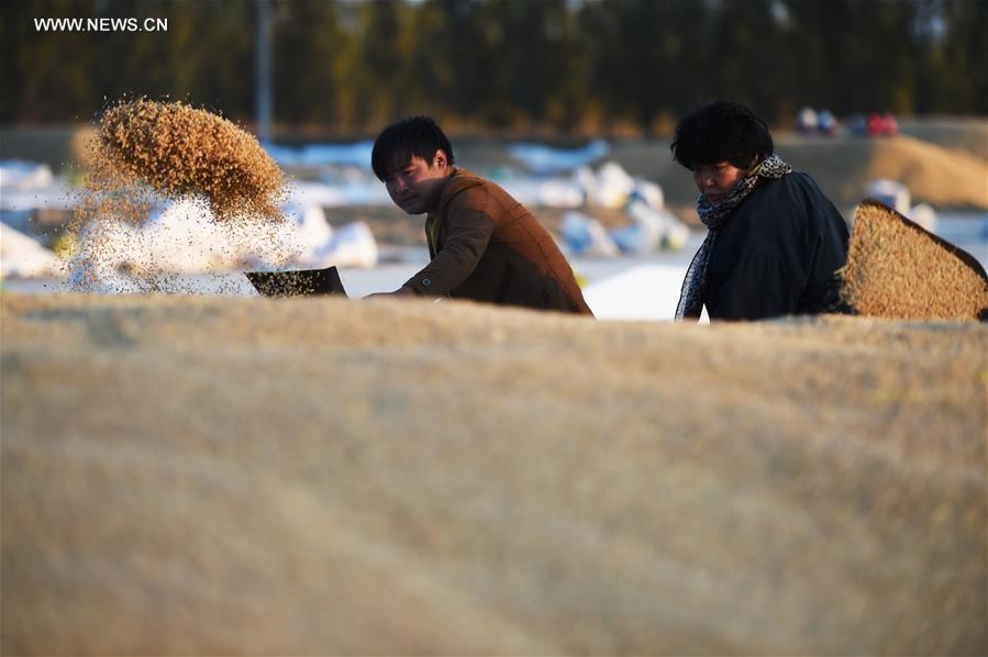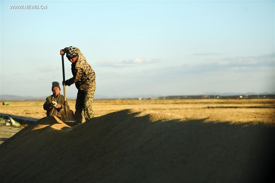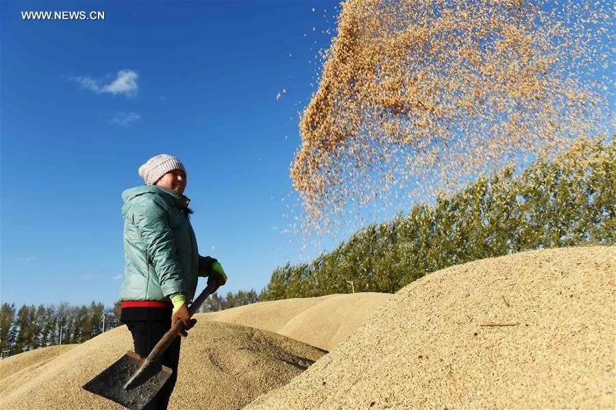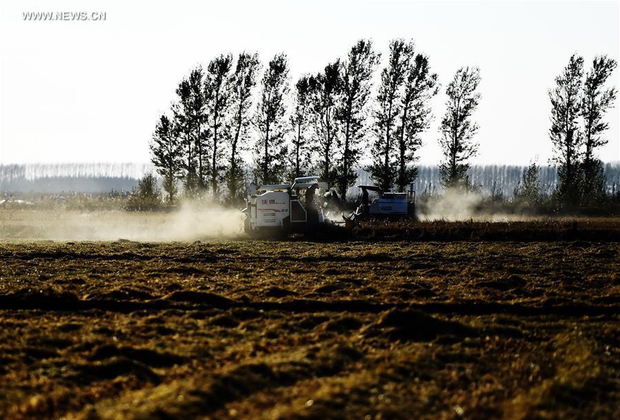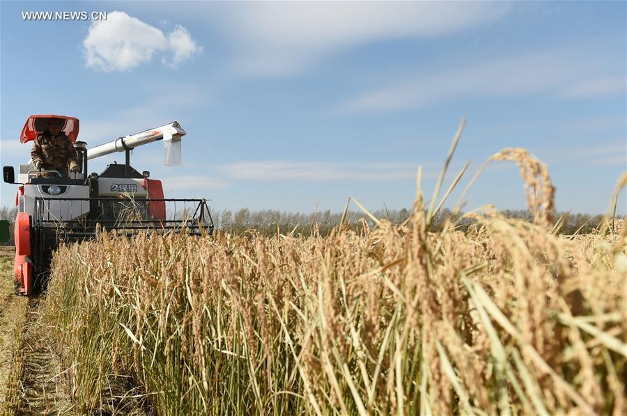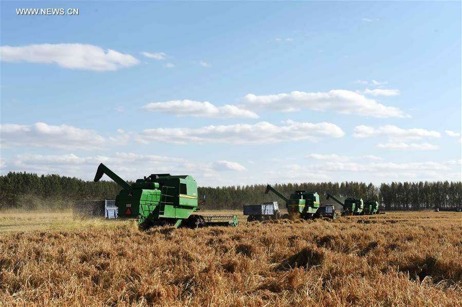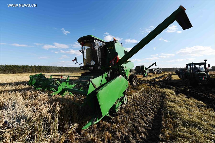 Reapers harvest paddy rice on the Daxing Farm in northeast China's Heilongjiang Province, Oct. 10, 2016. Daxing Farm in Heilongjiang is busy in the harvest season of paddy rice recently. (Xinhua/Wang Jianwei)