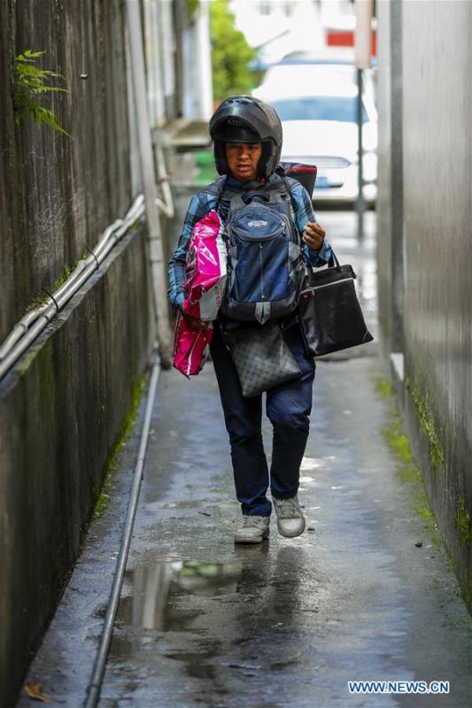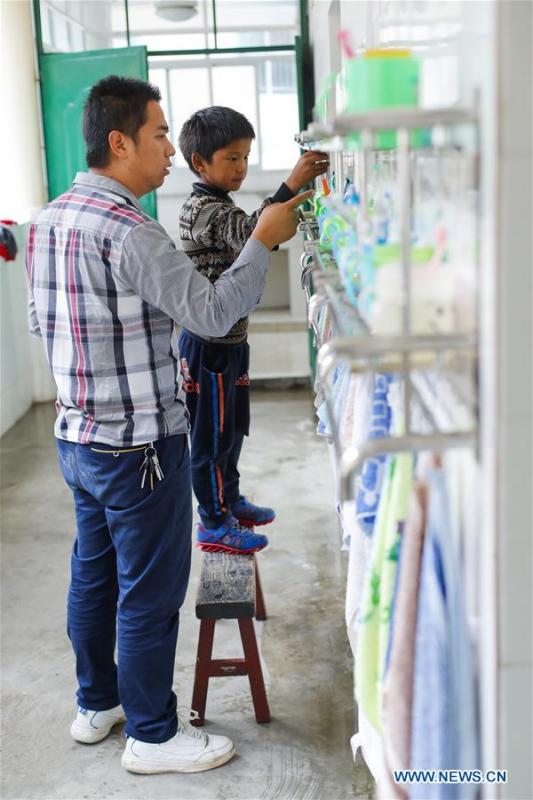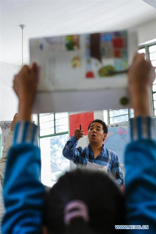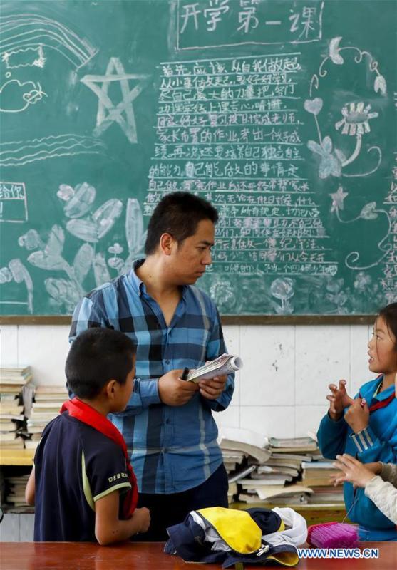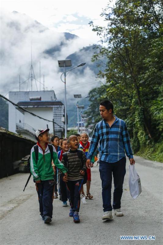Photo taken on Sept 28, 2016 shows Sang Lei helping students cross a river to Dimaluo village, a remote village in Nujiang Lisu autonomous prefecture of Southwest China's Yunnan province. Sang Lei, a college graduate majored in computer education, has been as a voluntary teacher of Pengdang Primary School since 2007. In nearly ten years of teaching, he tried his best to provide better learning environment for his pupils. Since 2006, more than 500,000 young people in China like Sang Lei have gone to central and western China to offer educational support to the country's remote rural regions. (Photo/Xinhua)
