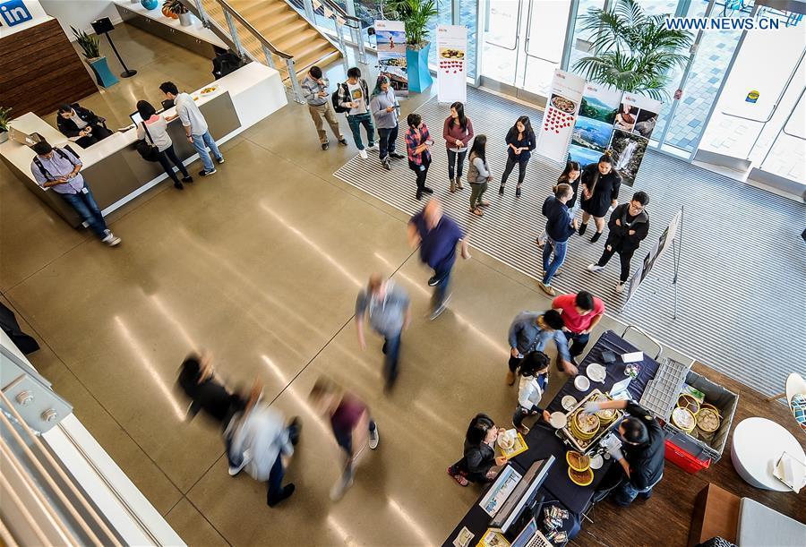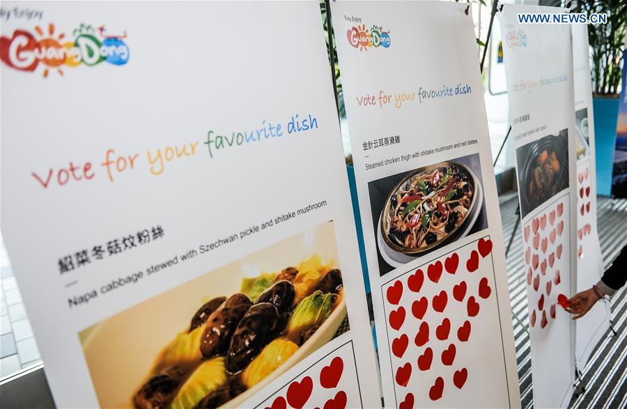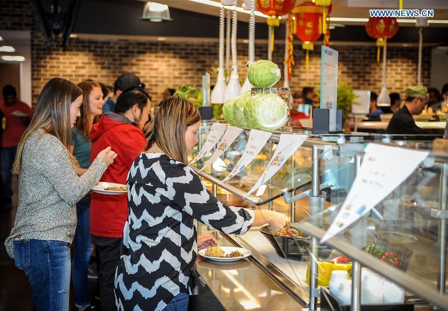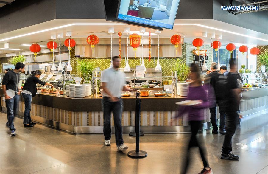 An employee puts on a favor sign after tasting the Guangdong cuisine at a cafeteria of a high tech firm in Silicon Valley, the United States, Oct. 11, 2016. Beginning on Monday, the Tourism Administration Board of China's Guangdong Province is holding a week-long event called "Guangdong Food Festival" by taking over the cafeteria of some leading tech firms in Silicon Valley. (Xinhua/Zhang Chaoqun)