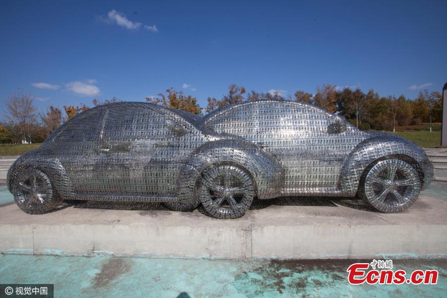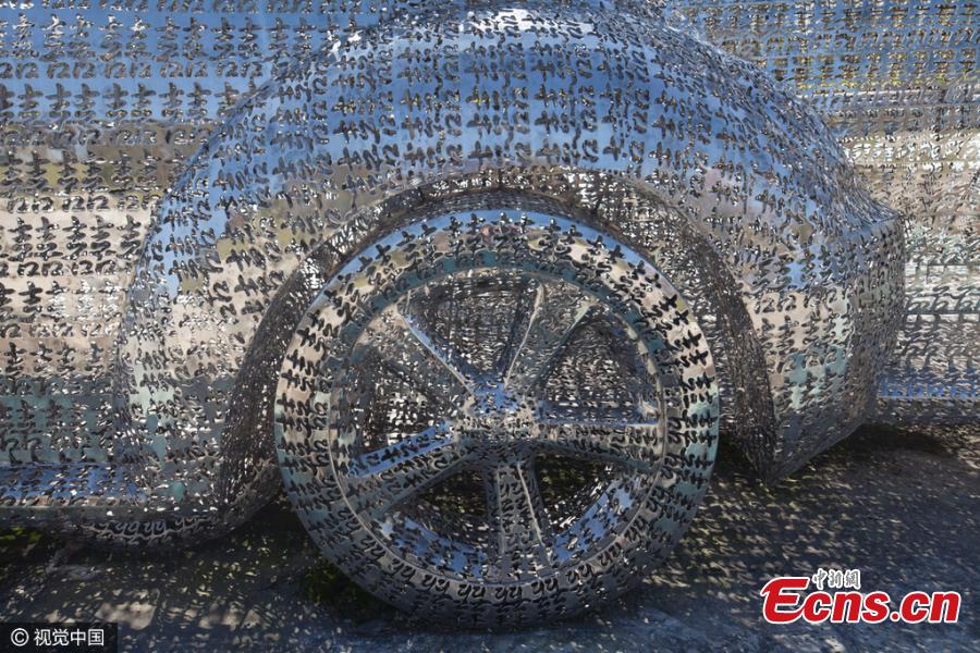 A car-shaped sculpture, featuring millions copies of the Chinese character Xi (double happiness), in a park in Changchun City, the capital of Northeast China’s Jilin Province, Oct. 11, 2016. The sculpture is a landmark in the park. (Photo/CFP)