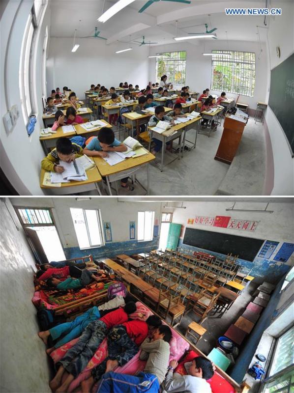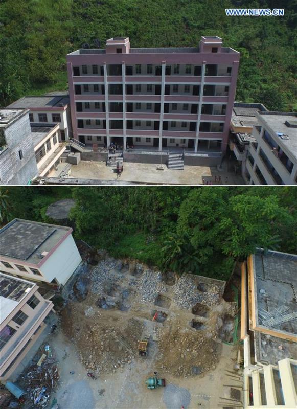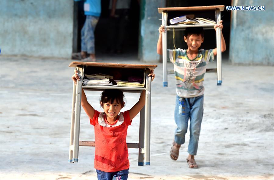 Students move desks into the newly-built building at Yudong primary school in Longfu Township of Du'an Yao Autonomous County, south China's Guangxi Zhuang Autonomous Region, Sept. 20, 2016. Guangxi plans to further improve the education quality in poverty-stricken areas during China's Thirteenth Five-Year Plan (2016-2020). (Xinhua/Huang Xiaobang)
