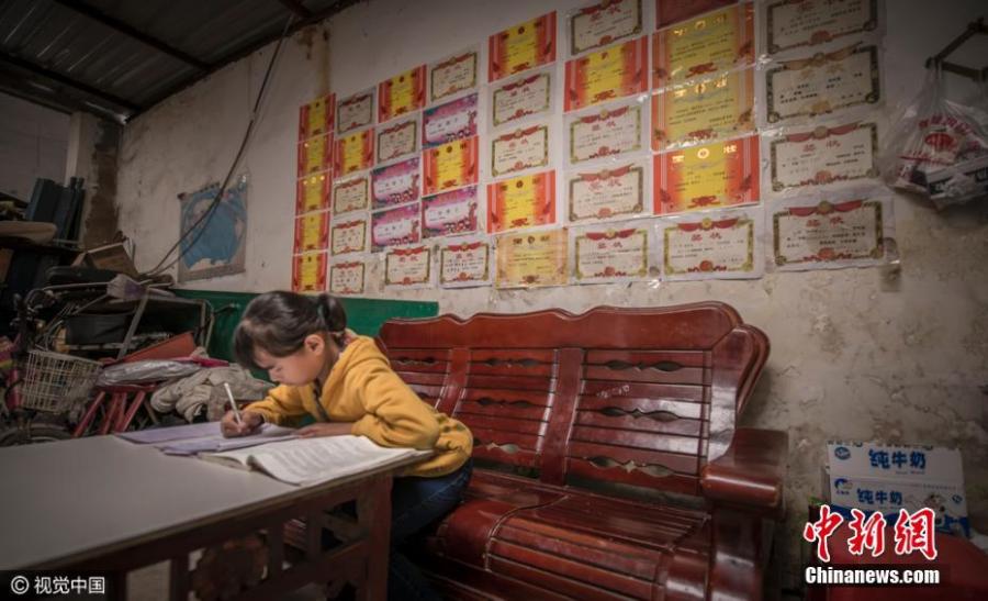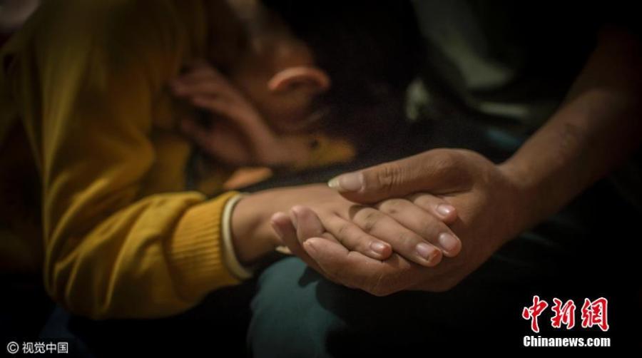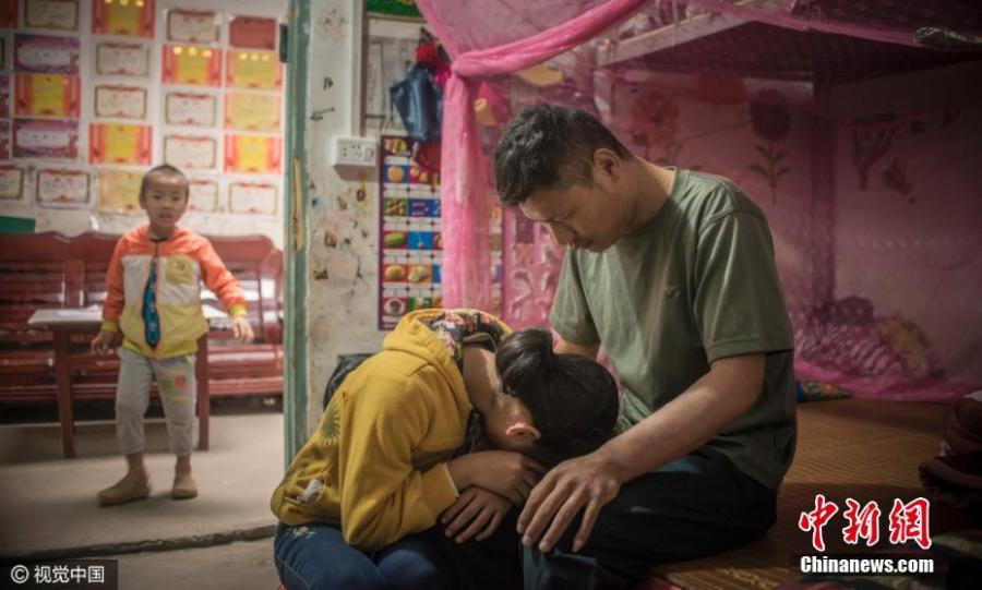 The 11-year-old Qiao Die cries on the legs of her father, Qian Xin, 34, who was diagnosed with uremia in July and could not afford treatment. The girl wishes to donate her kidney to her father, saying that a living father is what would make her the happiest.(Photo/CFP)