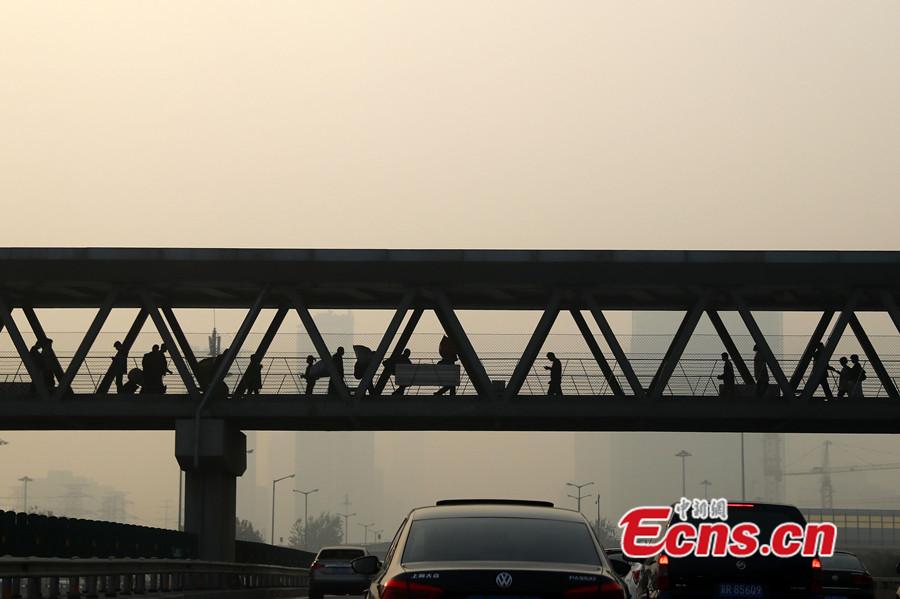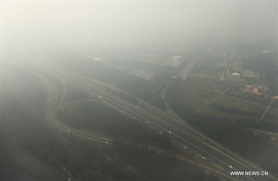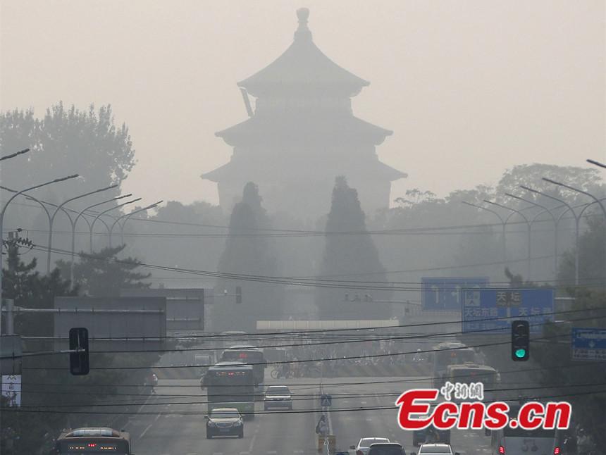 Photo taken on Oct. 13, 2016 shows buildings shrouded in smog in Beijing, capital of China, Oct. 13, 2016. A blue alert for air pollution was issued on Thursday in Beijing. (Photo/Xinhua)