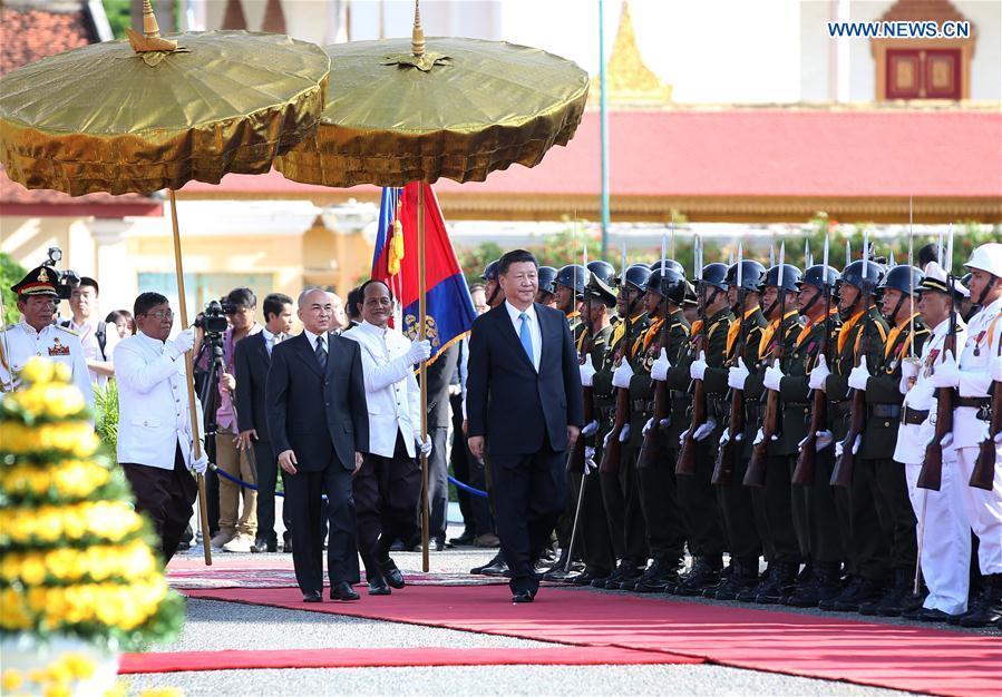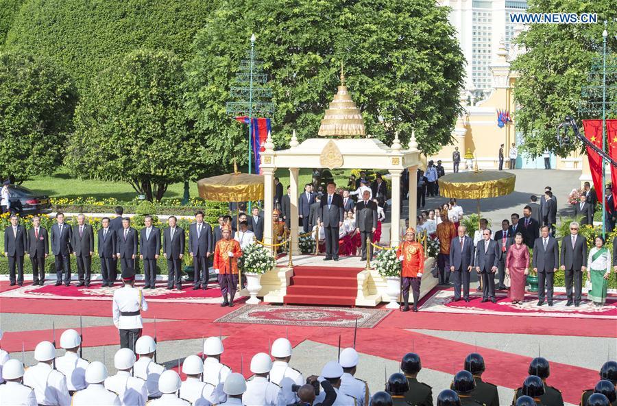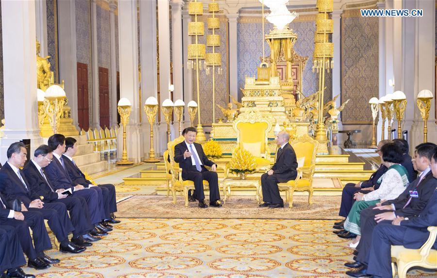 Chinese President Xi Jinping meets with Cambodian King Norodom Sihamoni in Phnom Penh, capital of Cambodia, Oct. 13, 2016. (Photo/Xinhua)