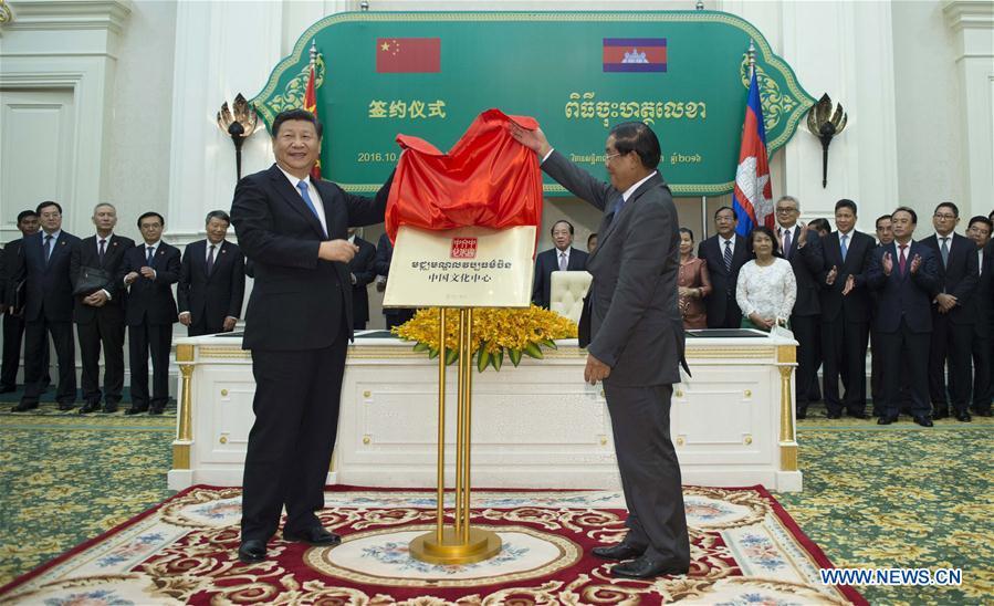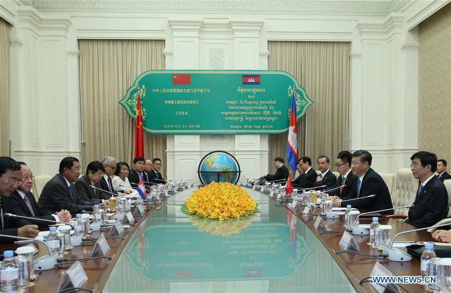 Chinese President Xi Jinping(L) shakes hands with Cambodian Prime Minister Hun Sen in Phnom Penh, capital of Cambodia, Oct. 13, 2016. (Photo/Xinhua)