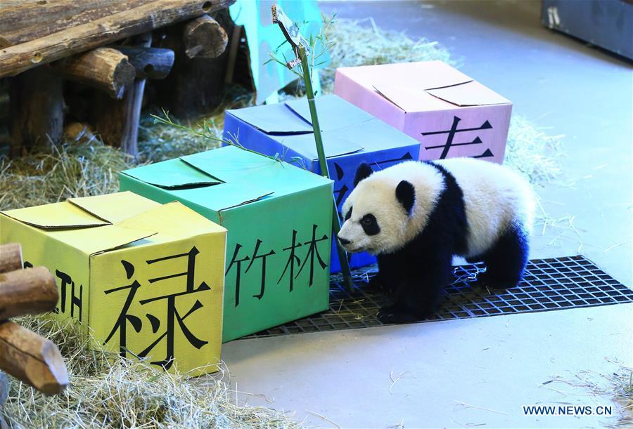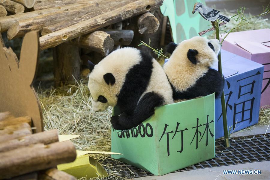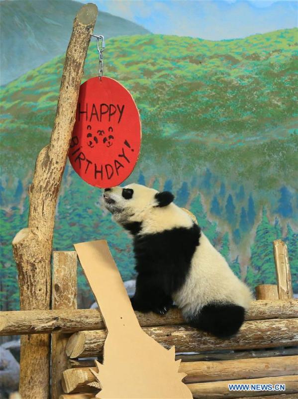 Panda cubs Jia Yueyue and Jia Panpan play at the decorated birthday party room at the Toronto Zoo in Toronto, Canada, Oct. 13, 2016. The Toronto Zoo hosted a First Birthday Celebration for its giant panda cubs Jia Panpan (meaning Canadian Hope) and Jia Yueyue (meaning Canadian Joy) on Thursday. The female giant panda Er Shun from China gave birth to the twin cubs in Toronto Zoo on Oct. 13, 2015. (Photo/Xinhua)