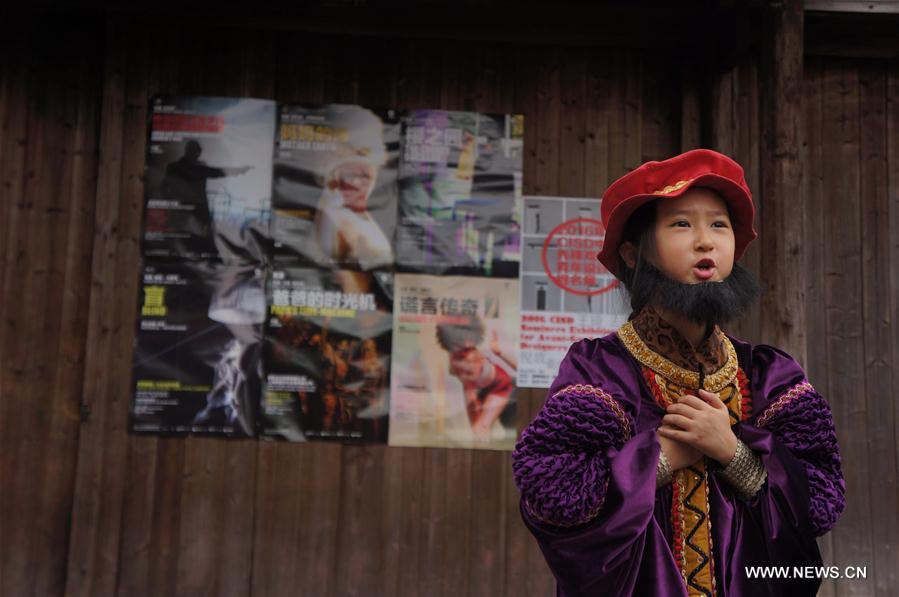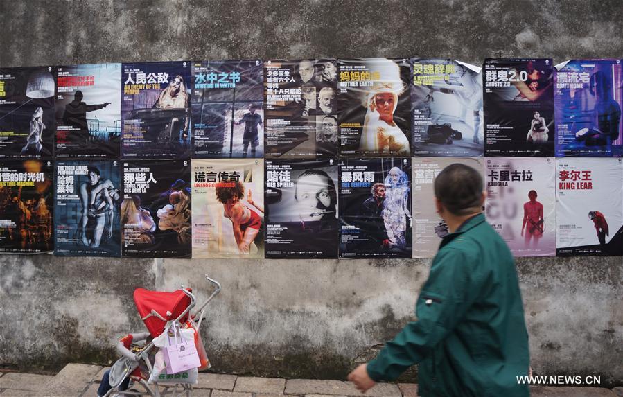 A visitor walks past posters during the Wuzhen Theater Festival in Tongxiang City, east China's Zhejiang Province, Oct. 15, 2016. The festival is held from Oct. 13 to 22. (Xinhua/Du Xiaoyi)