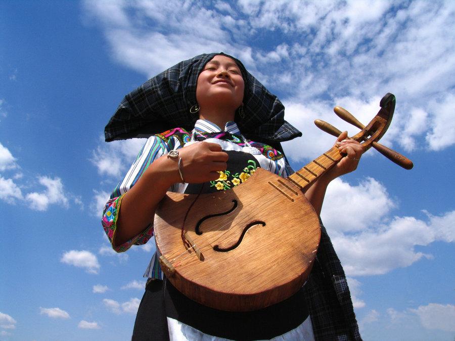 A Bouyei woman plays the traditional instrument, the yueqin, in a performance. (Photo/China Daily and Xinhua)