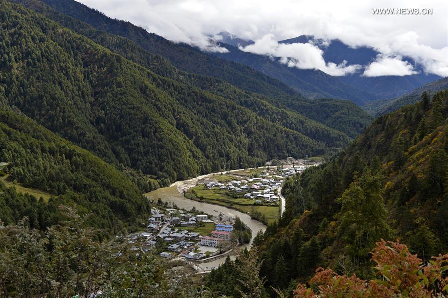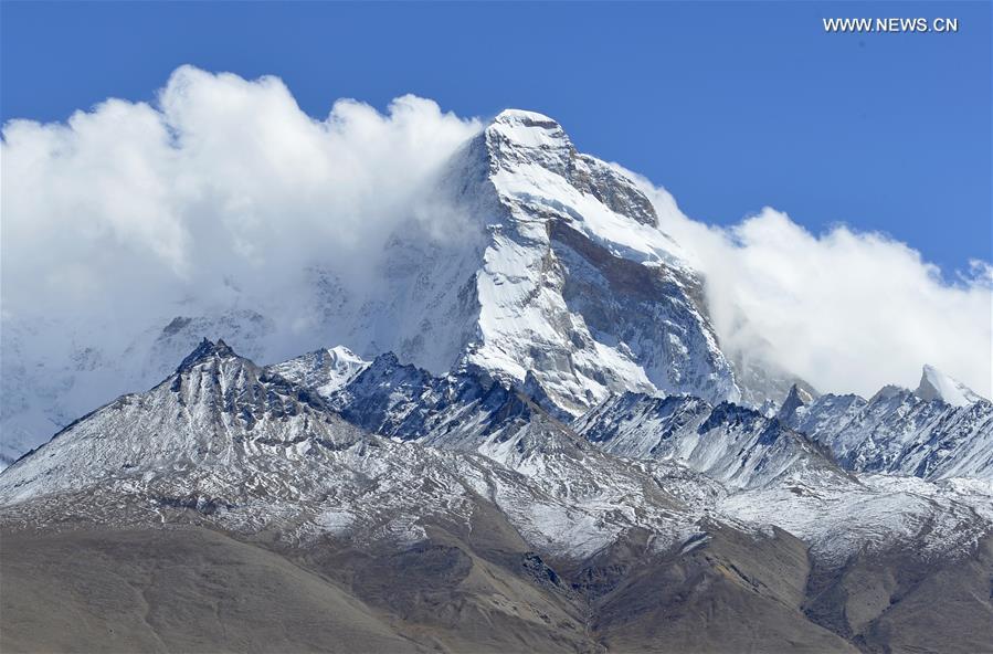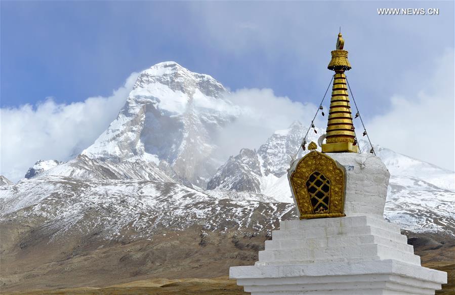 Photo taken on Oct. 13, 2016 shows a white pagoda and Mount Chomolhari in Yadong County, southwest China's Tibet Autonomous Region. (Photo/Xinhua)
