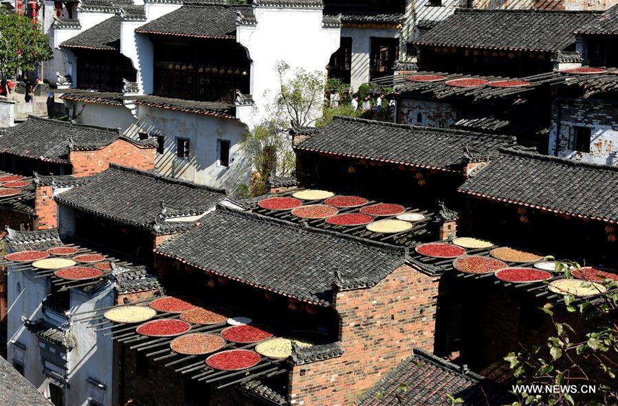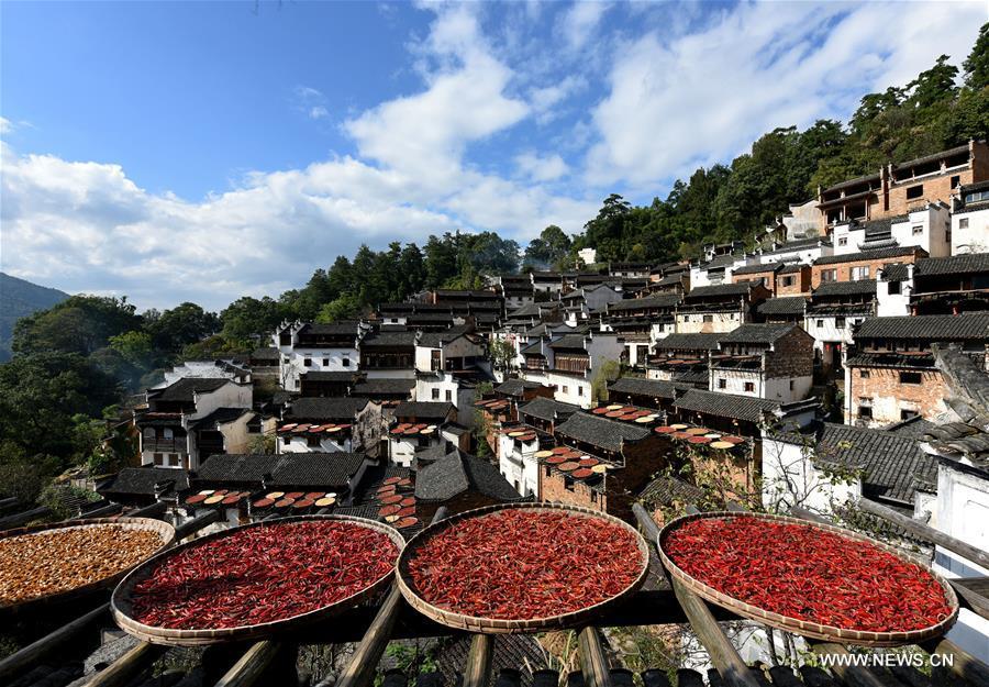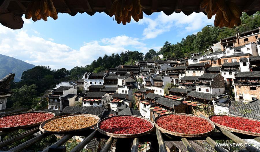 Photo taken on Oct. 15, 2016 shows the air-dried hot pepper and crops in Huangling Village of Wuyuan County, east China's Jiangxi Province. (Photo/Xinhua)