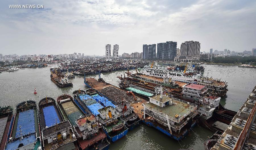 Vessels are anchored at a harbor in Haikou, capital of south China's Hainan Province, Oct. 17, 2016. China's southern island province of Hainan is gearing up to guard against Typhoon Sarika, which is expected to make landfall on Tuesday. (Photo/Xinhua)