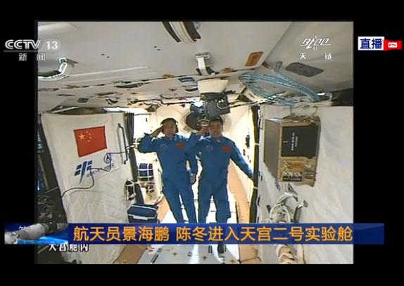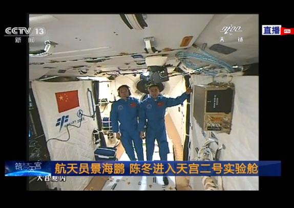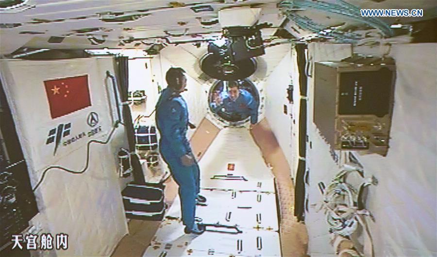 Two astronauts of Shenzhou-11 manned spacecraft successfully entered Tiangong-2 space lab Wednesday morning, according to Beijing Aerospace Control Center (BACC). (Photo/CCTV)