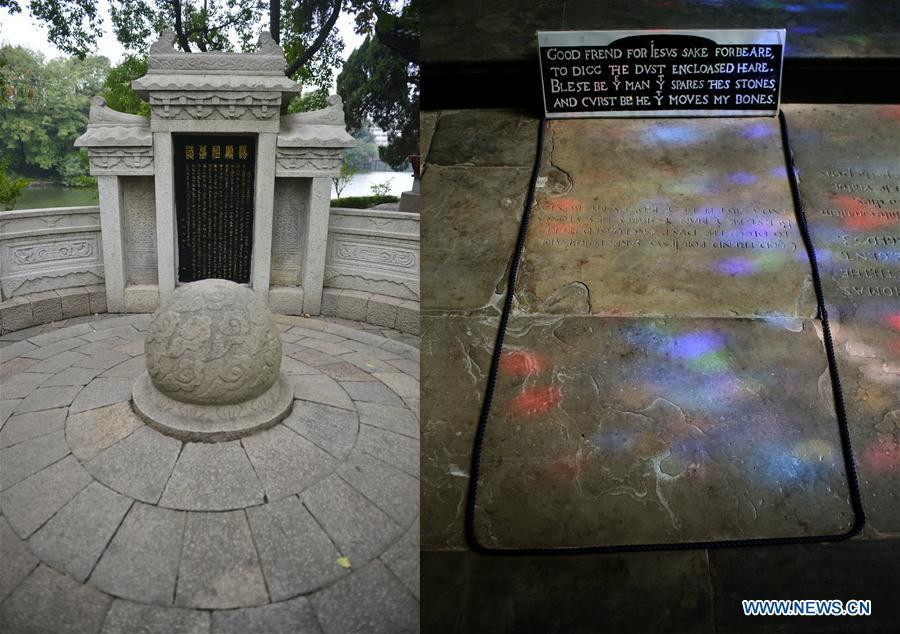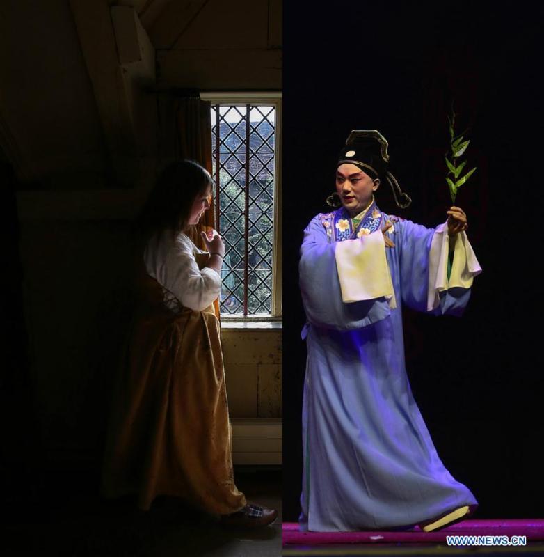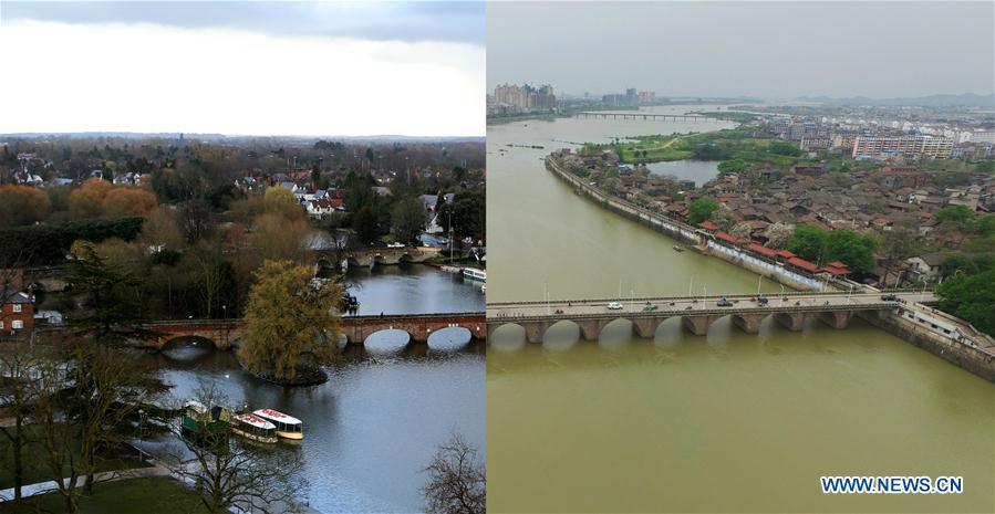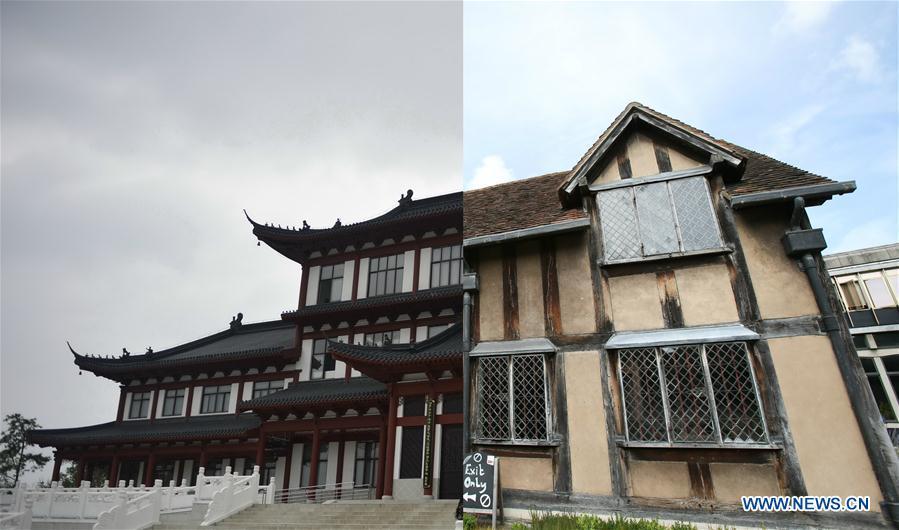Combination photo taken on March 24, 2015 by Han Yan (L) shows the hometown of British writer William Shakespeare in Stratford-upon-Avon, Britain and taken on April 6, 2016 by Zhou Mi (R) shows the hometown of Chinese playwright Tang Xianzu in Fuzhou of east China's Jiangxi Province. This year marks the 400th anniversary of the passing of the two literary giants from east and west respectively. (Photo/Xinhua)