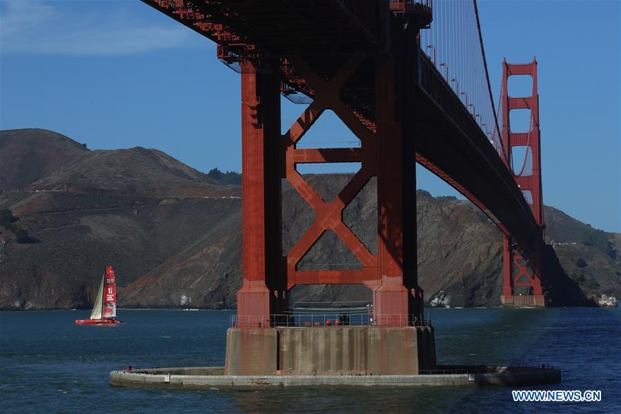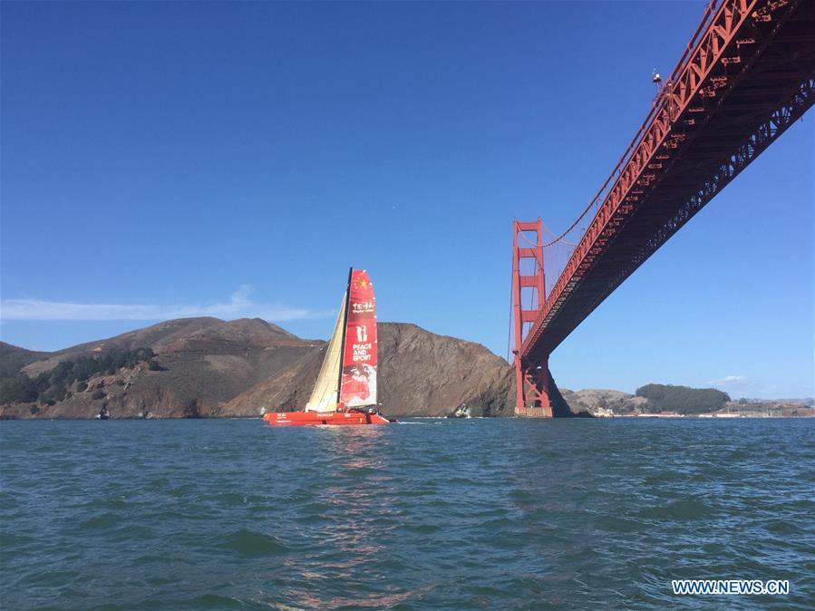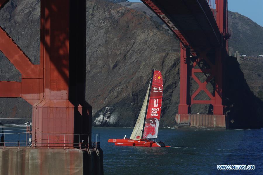 Chinese mariner Guo Chuan sails his trimaran under San Francisco's Golden Gate Bridge, the United States, embarking on a solo trans-Pacific voyage with Shanghai, China, as the destination, Oct. 18, 2016. He aims to complete the voyage within 20 days to set a new solo non-stop trans-Pacific sailing world record from San Francisco to Shanghai. The current record is 21 days set by crews of Italian Maserati. (Photo/Xinhua)