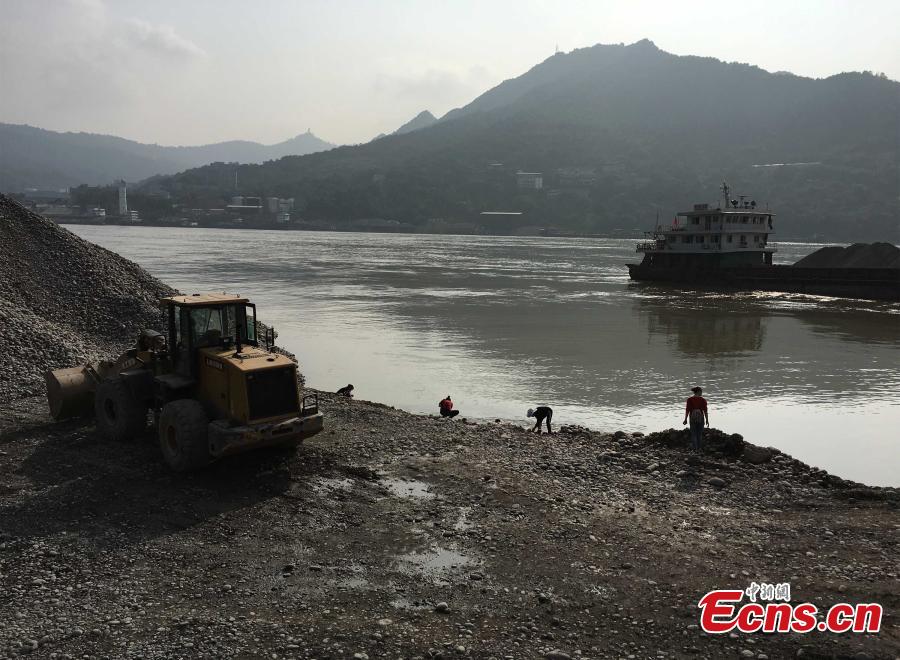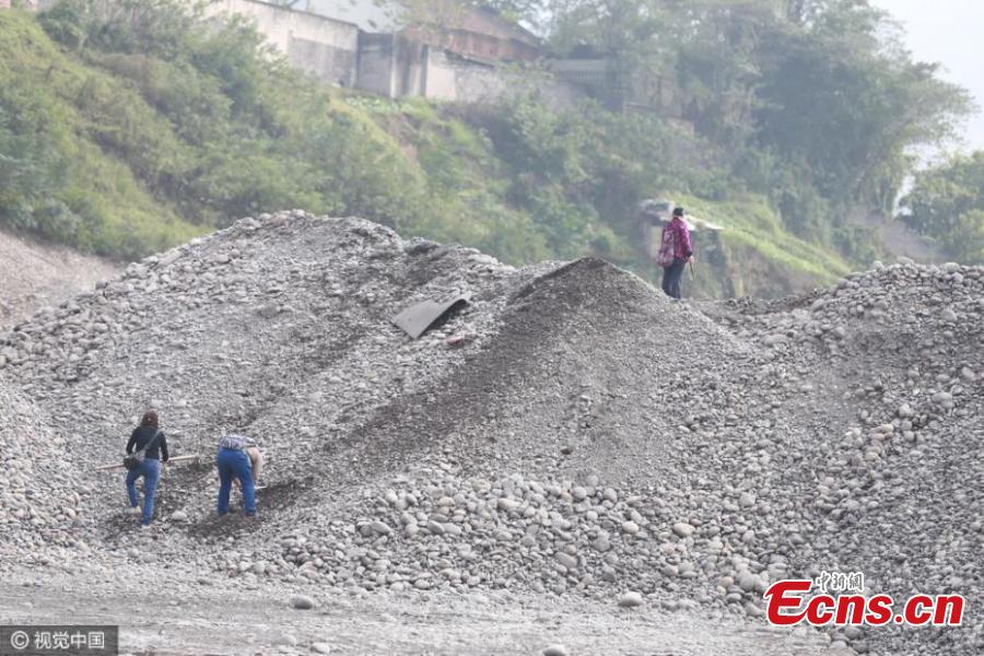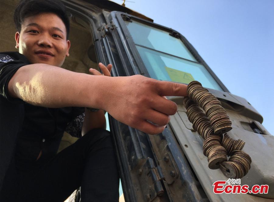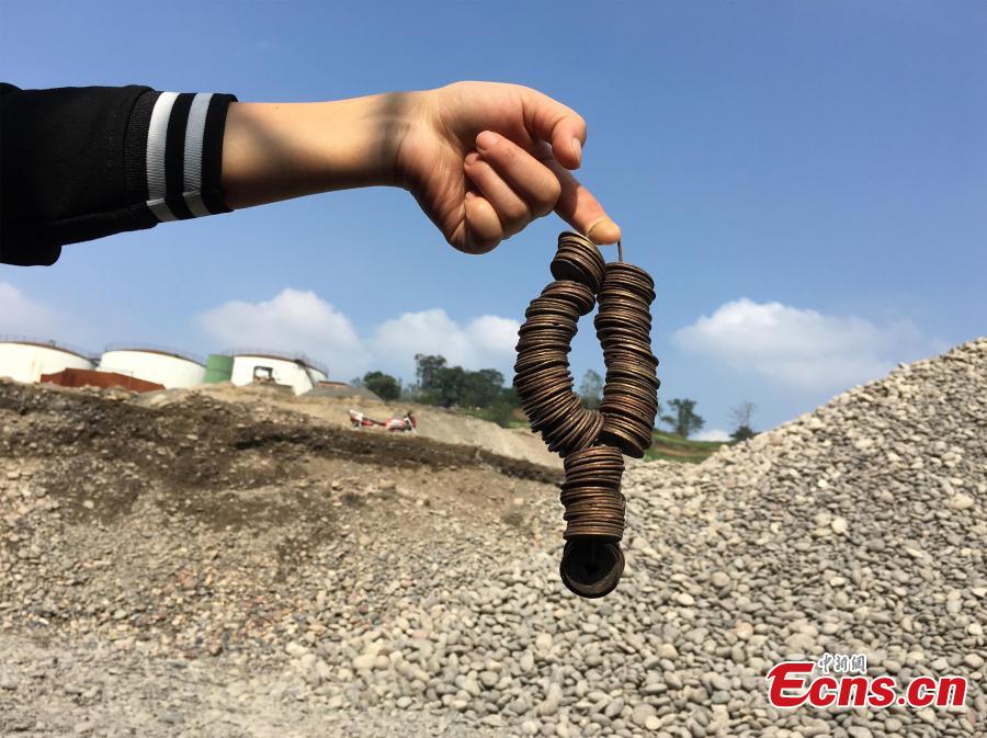 A man shows bronze coins found in cobblestones transported from the riverbed of the Yangtze River, at a wharf in Chongqing Municipality, Oct. 18, 2016. Many residents said they found coins among the stones. (Photo/CFP)