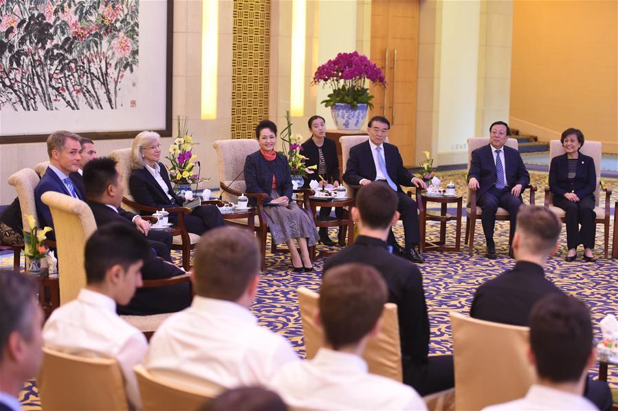 Peng Liyuan (L), Chinese President Xi Jinping's wife, holds an audience with a group of German high school students and teachers at the Diaoyutai State Guesthouse, in Beijing, capital of China, Oct. 19, 2016. (Photo/Xinhua)