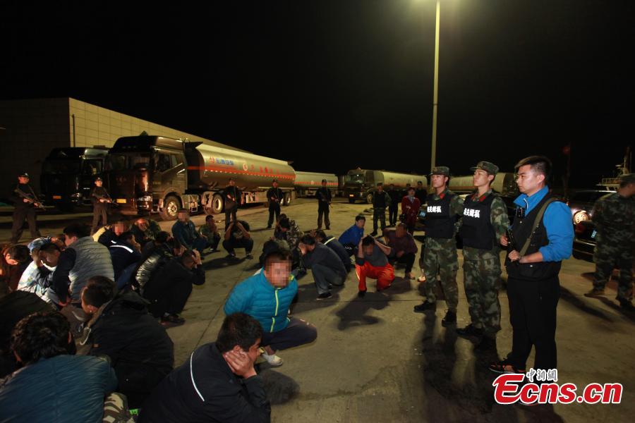 Suspects involved in smuggling petroleum products are seized in a raid jointly launched by customs in Dalian City in Northeast China’s Liaoning Province and Qingdao City of East China’s Shandong Province, and the coastguards of Liaoning. Some 29 suspects were caught in the raid and an oil tanker and 20 trucks confiscated. The illegal operation is thought to have been worth 60 million yuan. ($8.9 million). (Photo: China News Service/Gao Shuo)