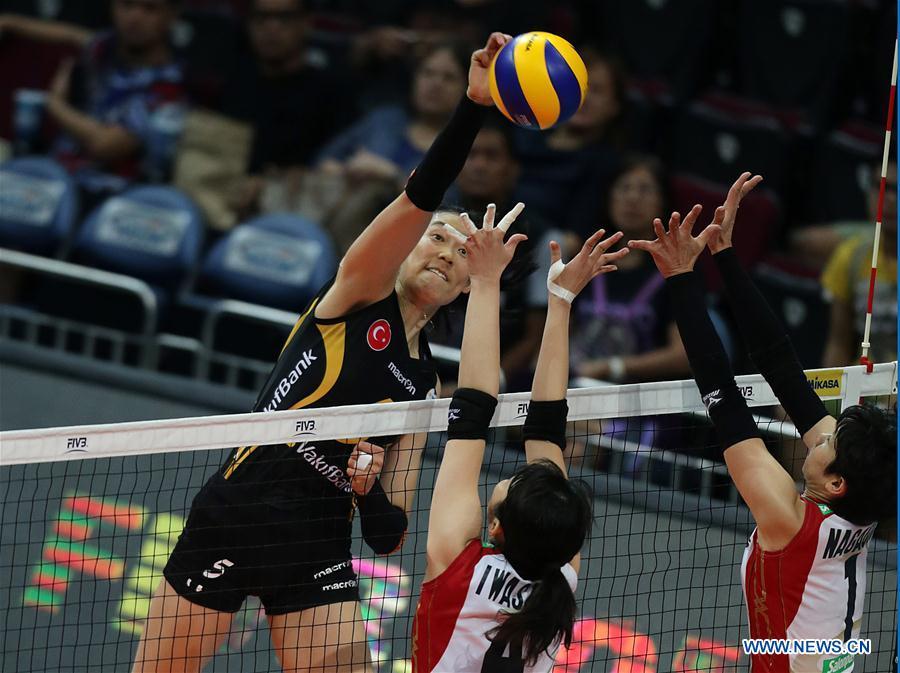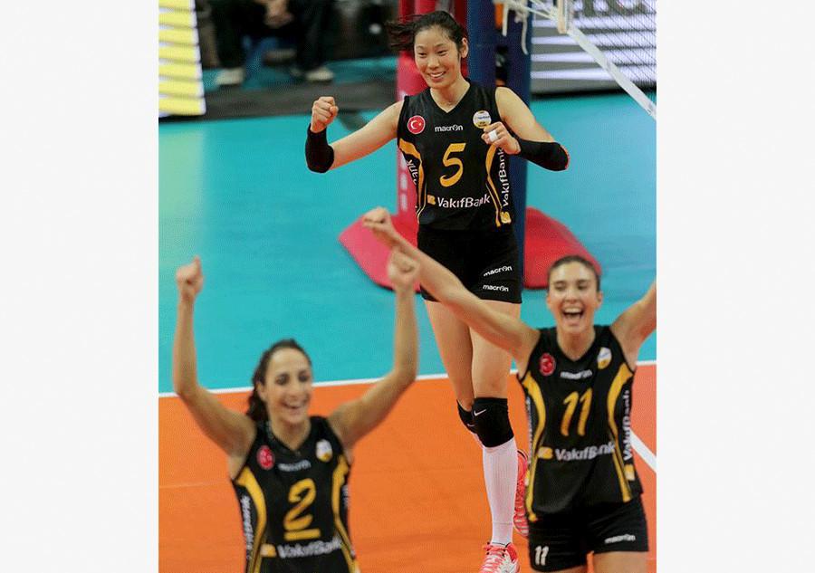 China's Zhu Ting (Rear) celebrates with her VakifBank Istanbul teammates after scoring in a match against Hisamitsu Springs Kobe during the 2016 FIVB Women's Club World Championship in Pasay City, the Philippines, Oct 18, 2016. VakifBank Istanbul won 3-1. Zhu scores the highest 28 points in the match. (Photo/Xinhua)