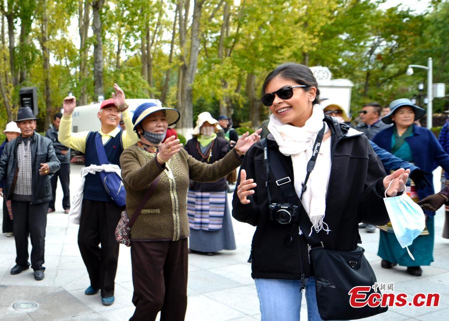 People perform a Guozhuang dance at a park near the Potala Palace in Lhasa, Southwest China’s Tibet Autonomous Region, Oct. 19, 2016. As one of the three major Tibetan folk dances, the Guozhuang dance involves "singing and dancing in a circle". (Photo: China News Service/Li Lin)
