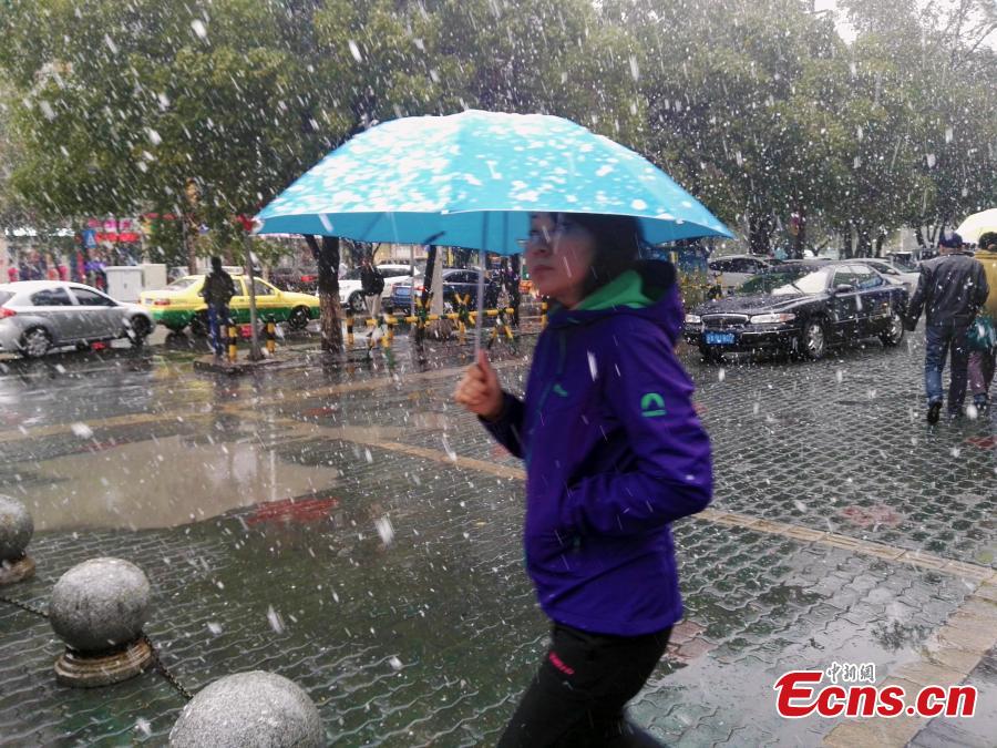 Snow falls in Urumqi City, the capital of Northwest China’s Xinjiang Uygur Autonomous Region, Oct. 19, 2016. The northwestern city had its first winter snow while temperatures dropped almost to one degree centigrade. (Photo: China News Service/Liu Xin)