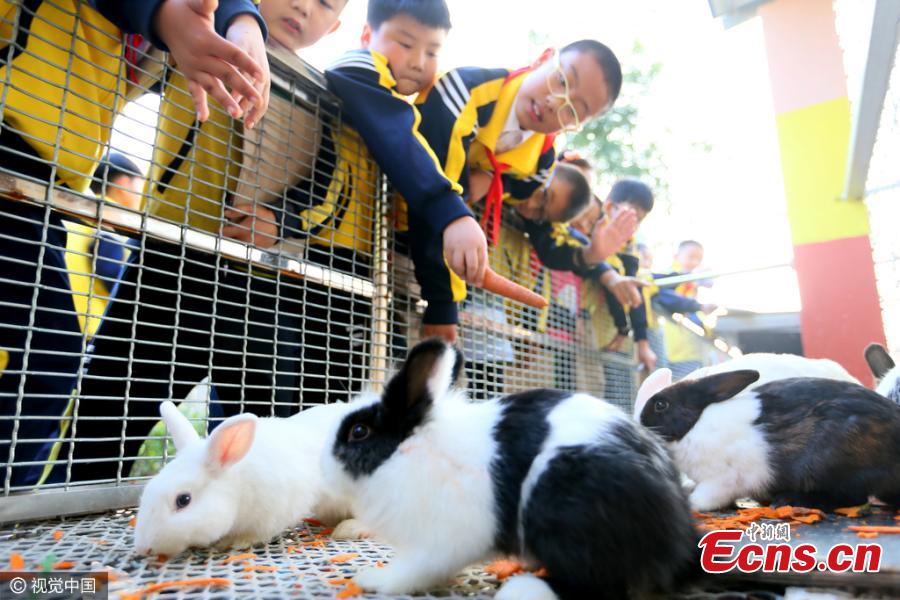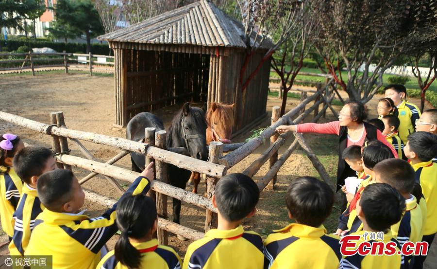 Students look at animals kept in an elementary school in Qingdao City, East China’s Shandong Province, Oct. 19, 2016. The school keeps 30 different types of animals, including peacocks, ostriches and turkeys, in a 2,000-square meter zone to help students understand nature and animals at a close distance. (Photo/CFP)
