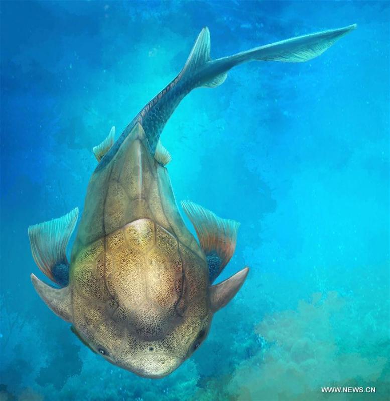 This illustration shows Qilinyu, a 423-million-year-old fish from the Kuanti Formation (late Ludlow, Silurian). Paleontologists from China and Sweden said Thursday that our jaws can be traced back to these extinct armored prehistoric fish that dominated the oceans, rivers and lakes over 400 million years ago. The findings, published in the U.S. journal Science, were based on a newly discovered fossil fish in Yunnan, southwest China, known as Qilinyu, which is part of the ancient armored fish. (Photo/Xinhua)