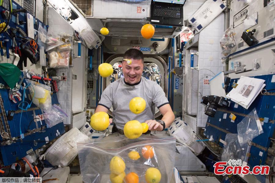 NASA astronaut Kjell Lindgren corrals the supply of fresh fruit that arrived on the Kounotori 5 H-II Transfer Vehicle (HTV-5), Aug. 25, 2015. (Photo/NASA)