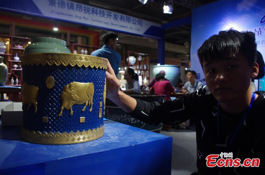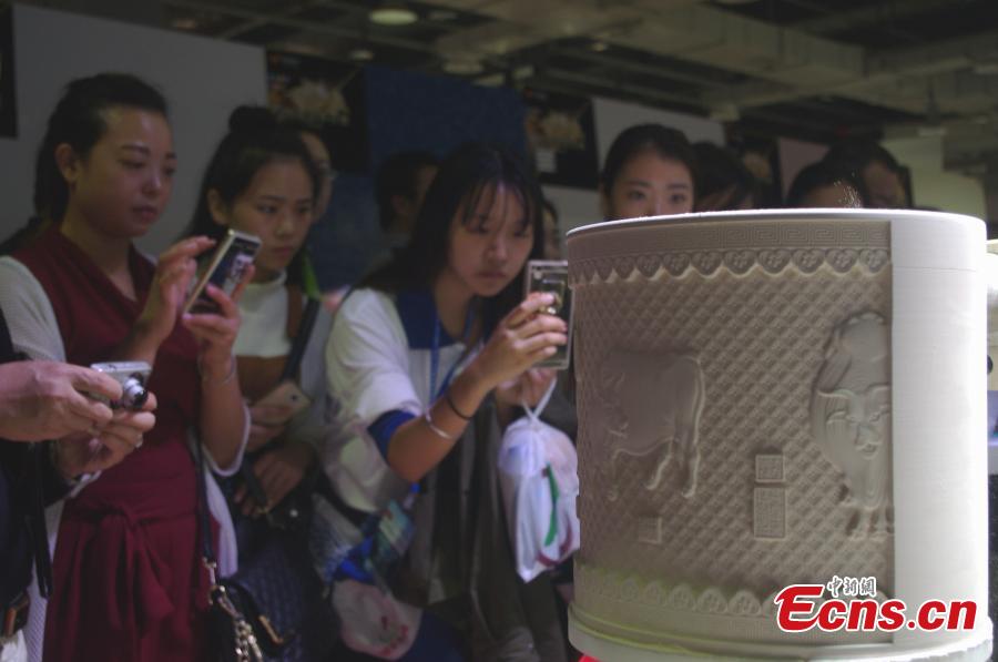 Visitors look at a piece of equipment to make porcelain works with the use of 3D printing technology at an exhibition in Jingdezhen, East China’s Jiangxi Province, Oct. 20, 2016. The machine can reduce production time from five days to 20 hours with high accuracy and a 100 percent success rate. Insiders say the new technology poses a threat to traditional manufacturing techniques. (Photo: China News Service/Wang Haoyang)