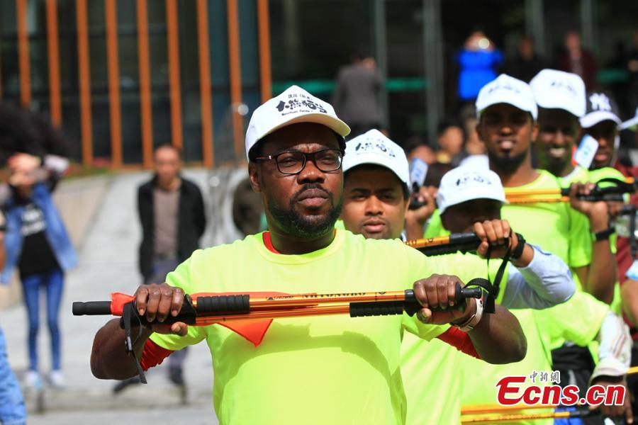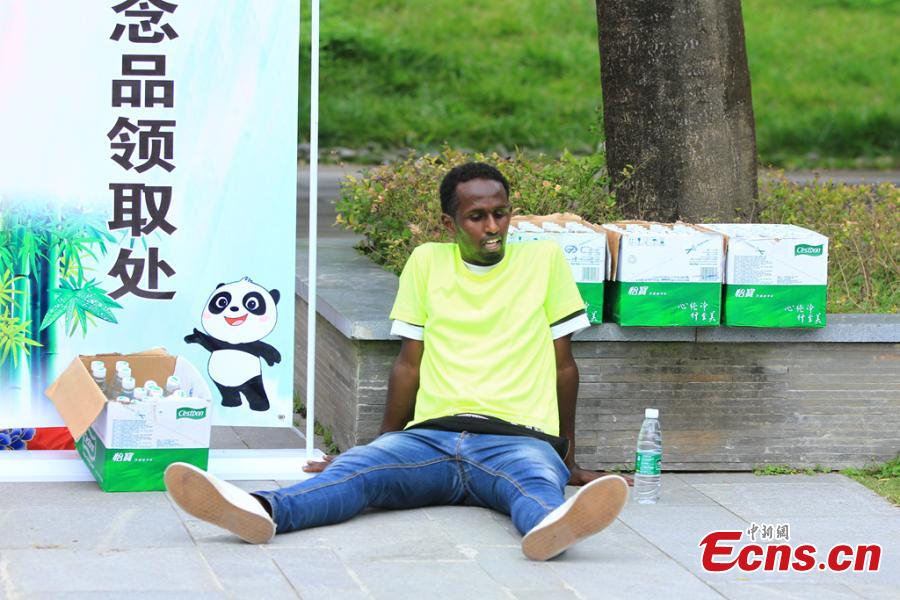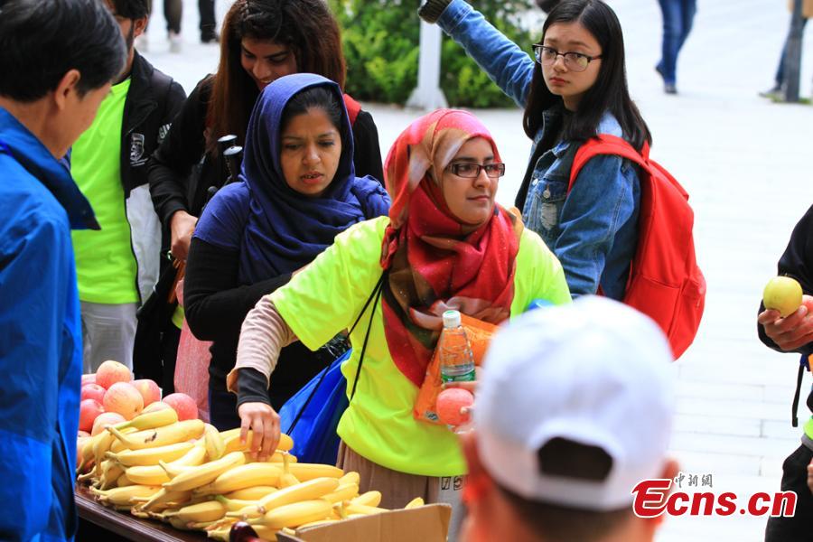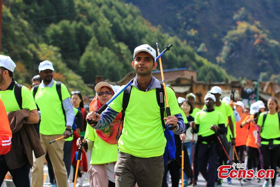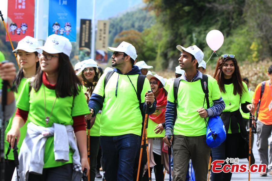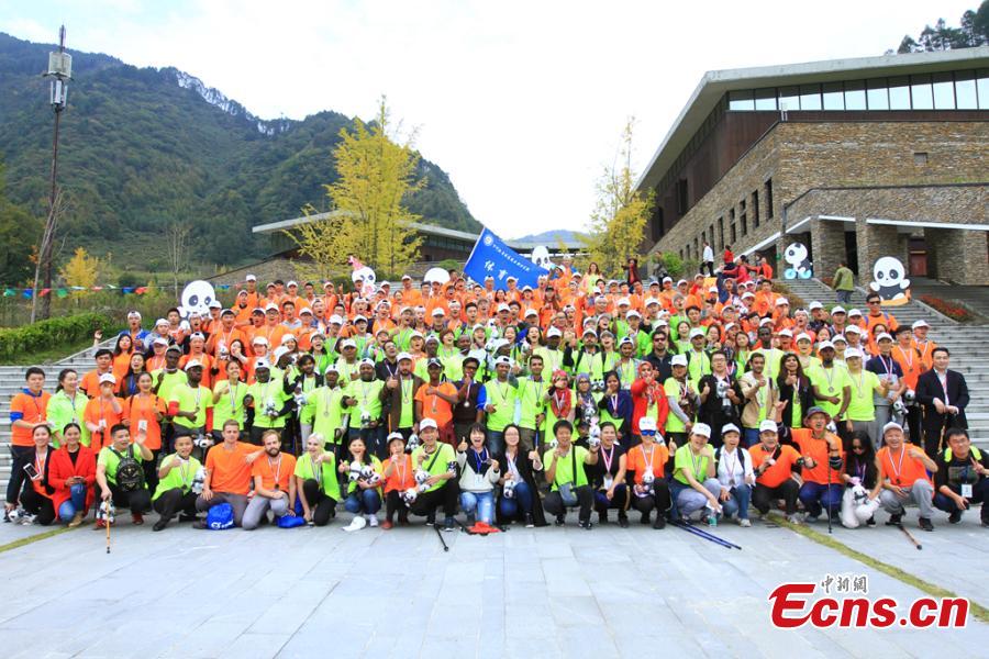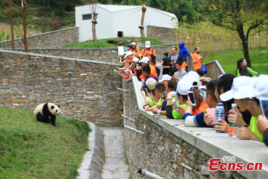 Participants look at a giant panda at the Wolong Nature Reserve in Southwest China’s Sichuan province, Oct. 20, 2016. More than 300 people from 16 countries and regions joined the 23.98-kilometer walking trip. (Photo: China News Service/Zhong Xin)